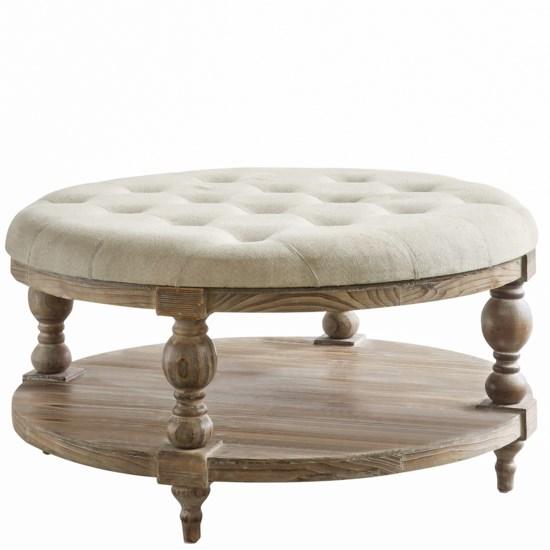 Tahoe Rustic Wood and Round Linen Ottoman