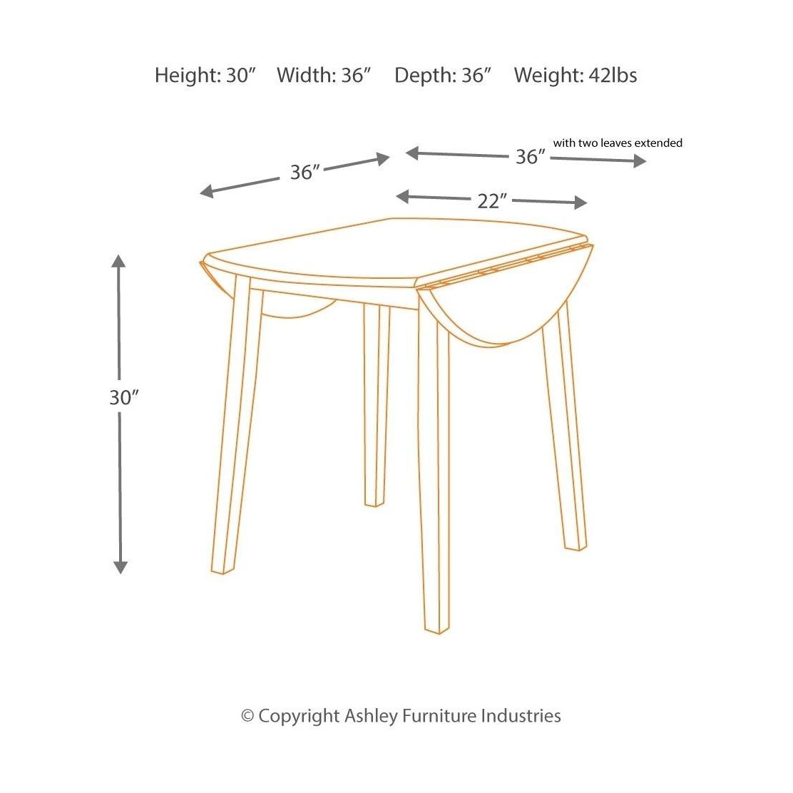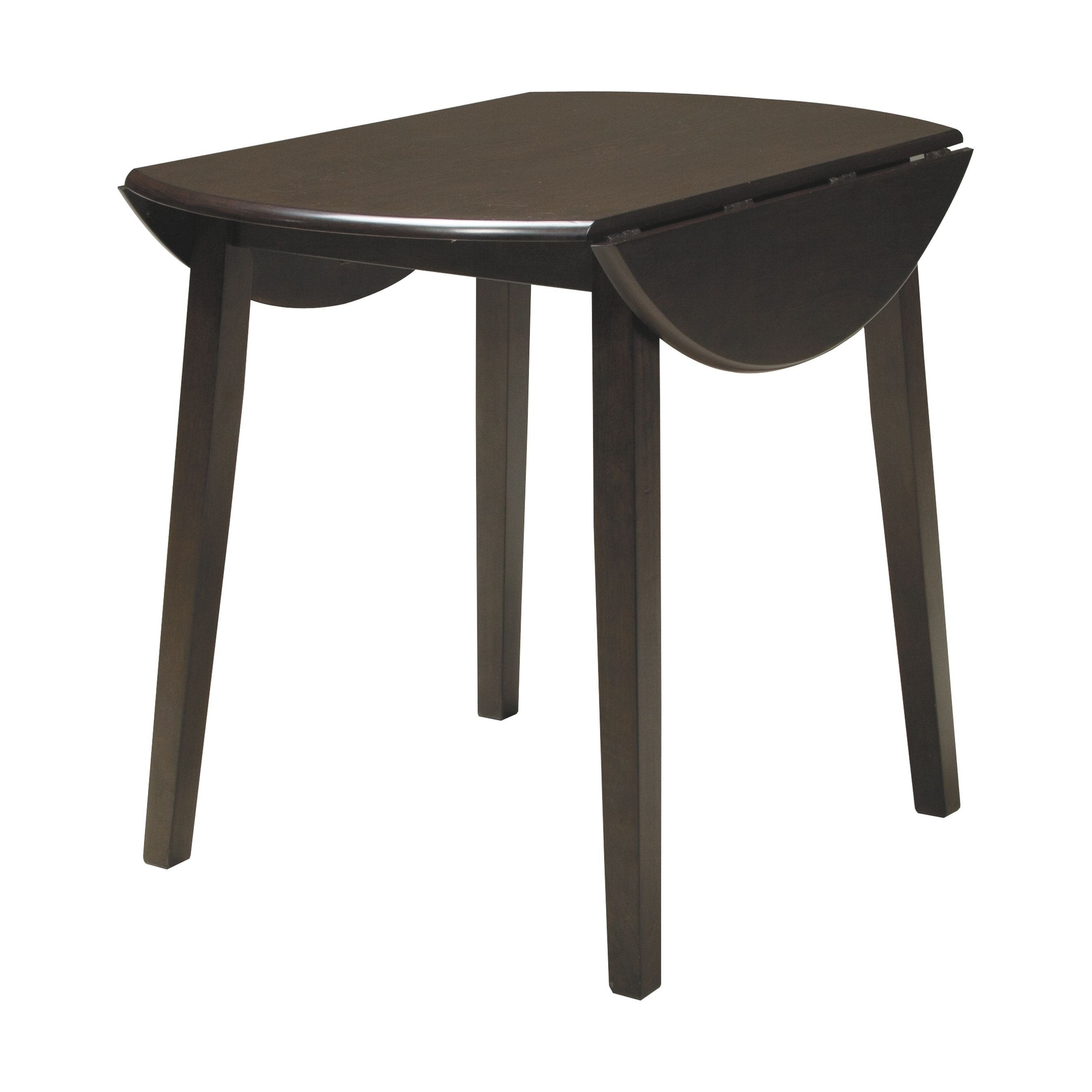 Hammis dining set sets you up for simply elegant style, even if you're tight on space. Round drop leaf table with flared legs is made of veneers, wood and manmade wood and finished in a dark brown with gray undertones. Accompanying rack back chairs are made of wood, with seat cushions upholstered in a matching dark brown vinyl, that makes a practical alternative to leather. Comfortably seats up to four.