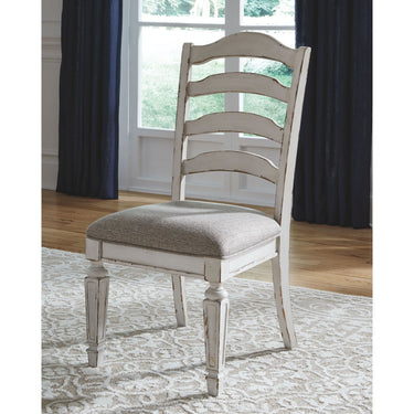 Bon app�tit. With its rounded ladderback styling, chipped white finish and plushly cushioned seat, the Realyn dining room chair has all the right ingredients for a French country-inspired feast for the eyes.