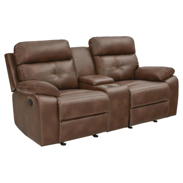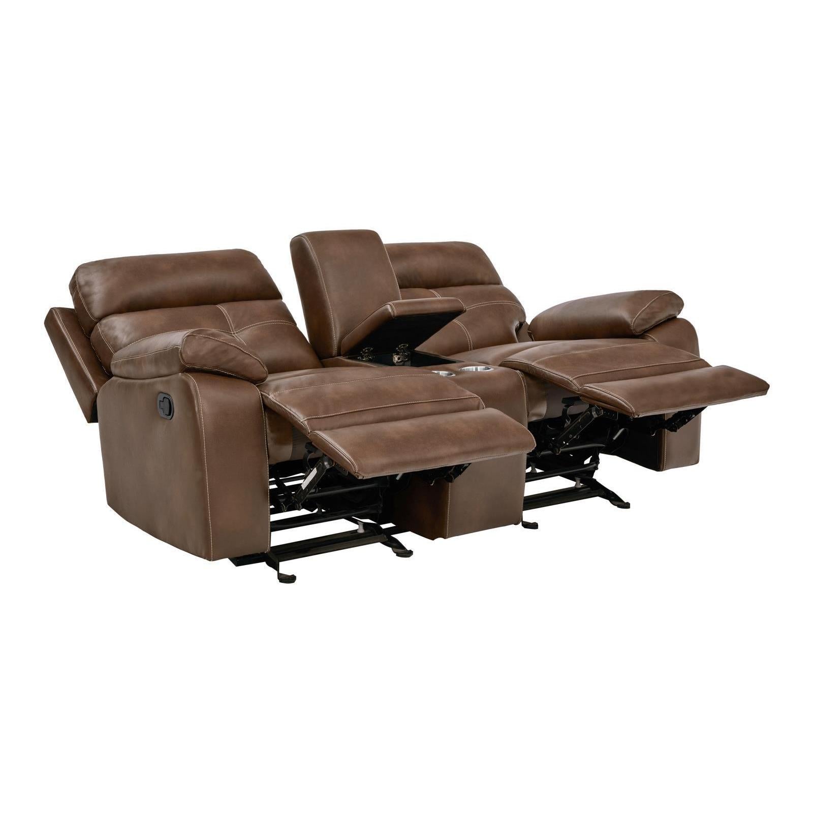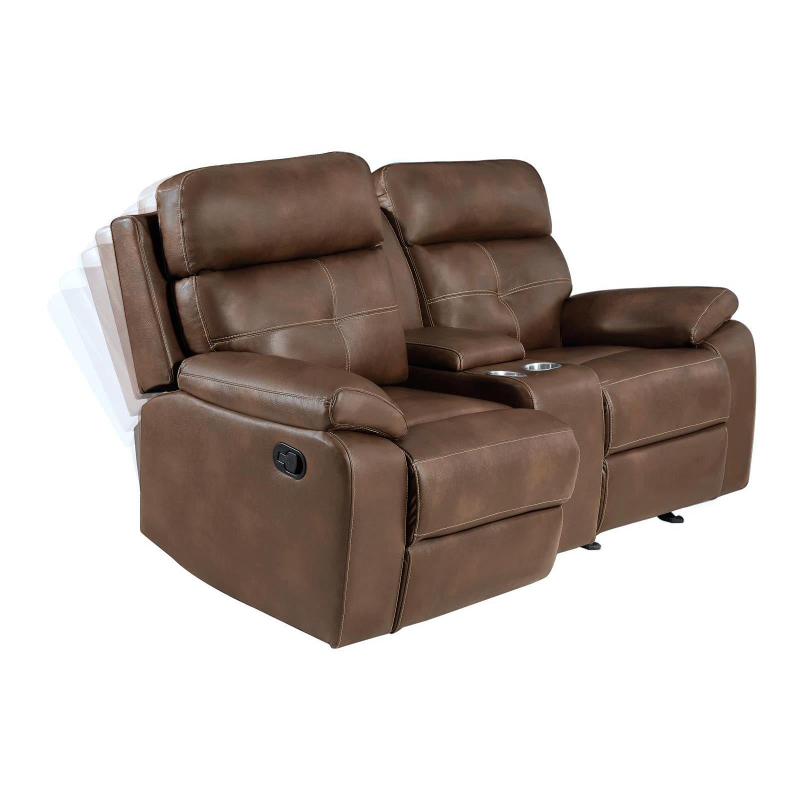 Create a mini entertainment room with this classic motion loveseat. sleek and warm, the loveseat is upholstered in a padded breathable leatherette fabric in a soft milk chocolate hue. ooze sophistication with the contrasting stitched details and slightly tufted back. store extra throw blankets or remotes in the hidden space to maintain a clean look. relax with your favorite movie in the reclining chairs with the built-in stainless-steel-look cup holders.