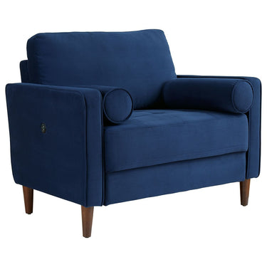 This chair juxtaposes timeless touches and modern style, bringing an aura of casual luxury to your living room. Softer than most in a navy blue velvet, the piece has a streamlined design that fits easily in smaller spaces. Roll-shaped bolster pillows provide comfort, while narrow track arms and peg legs add a clean, contemporary look. Convenient dual USB port keeps devices close at hand and ready for use.