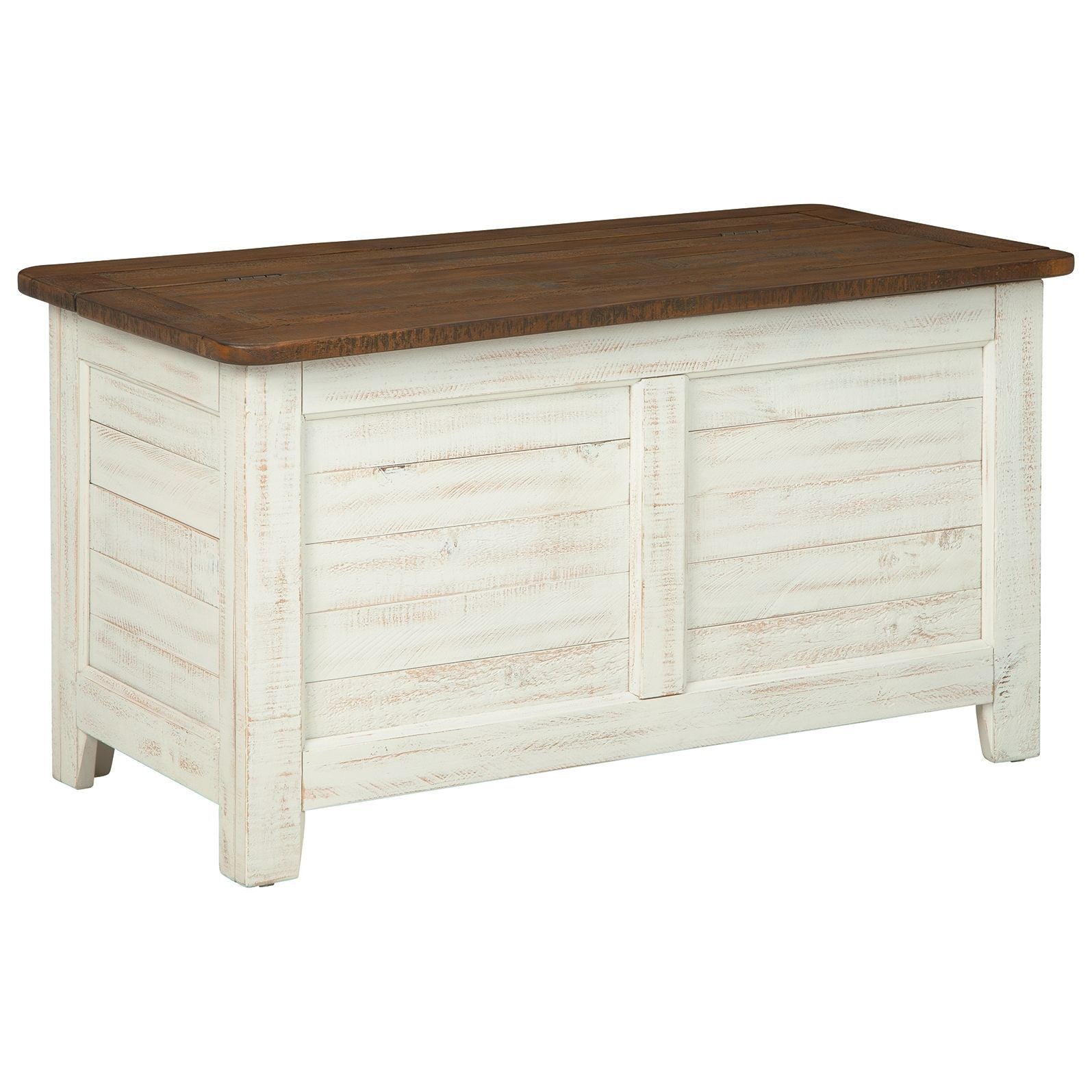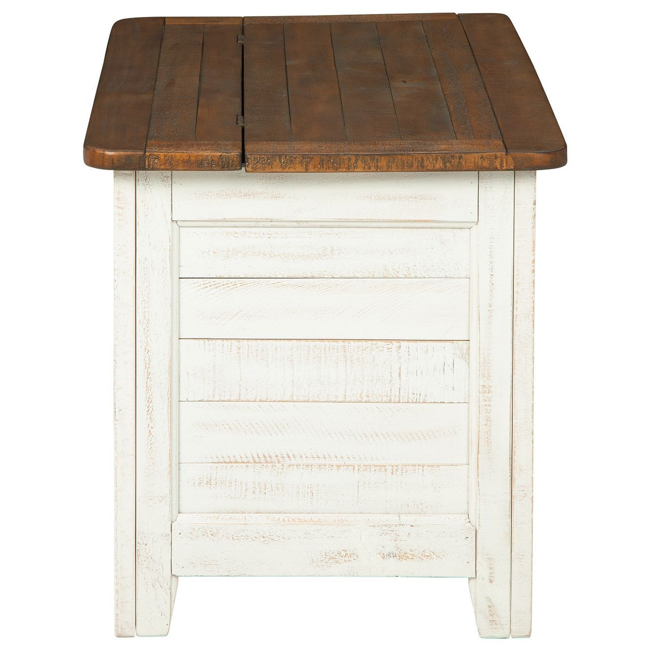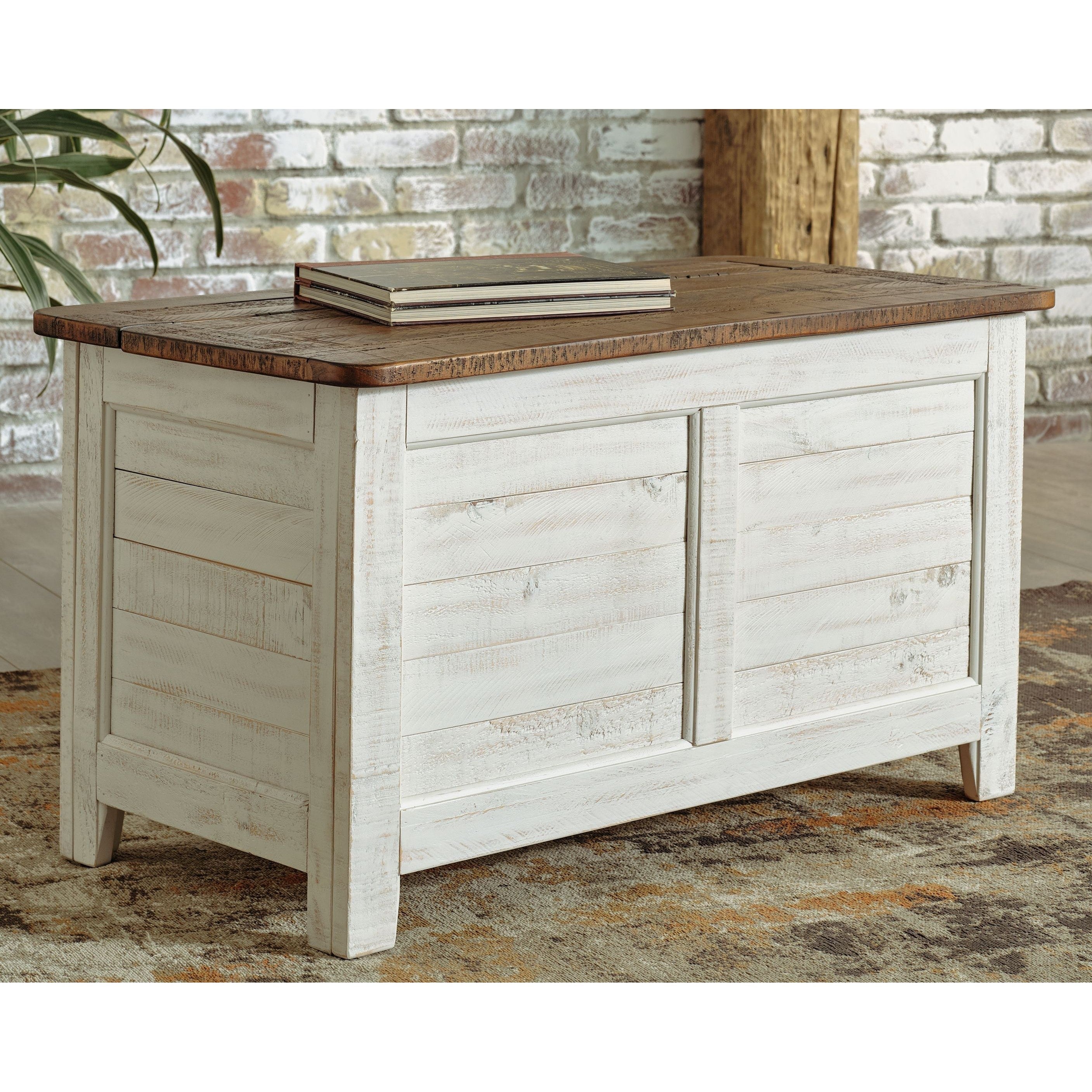 Storage solutions are made simple with this hinged top storage trunk. In distressed brown and white finish, this storage trunk oozes casual glam. A distressed planked effect on the front and sides brings subtle texture that gives this piece a little extra flair.