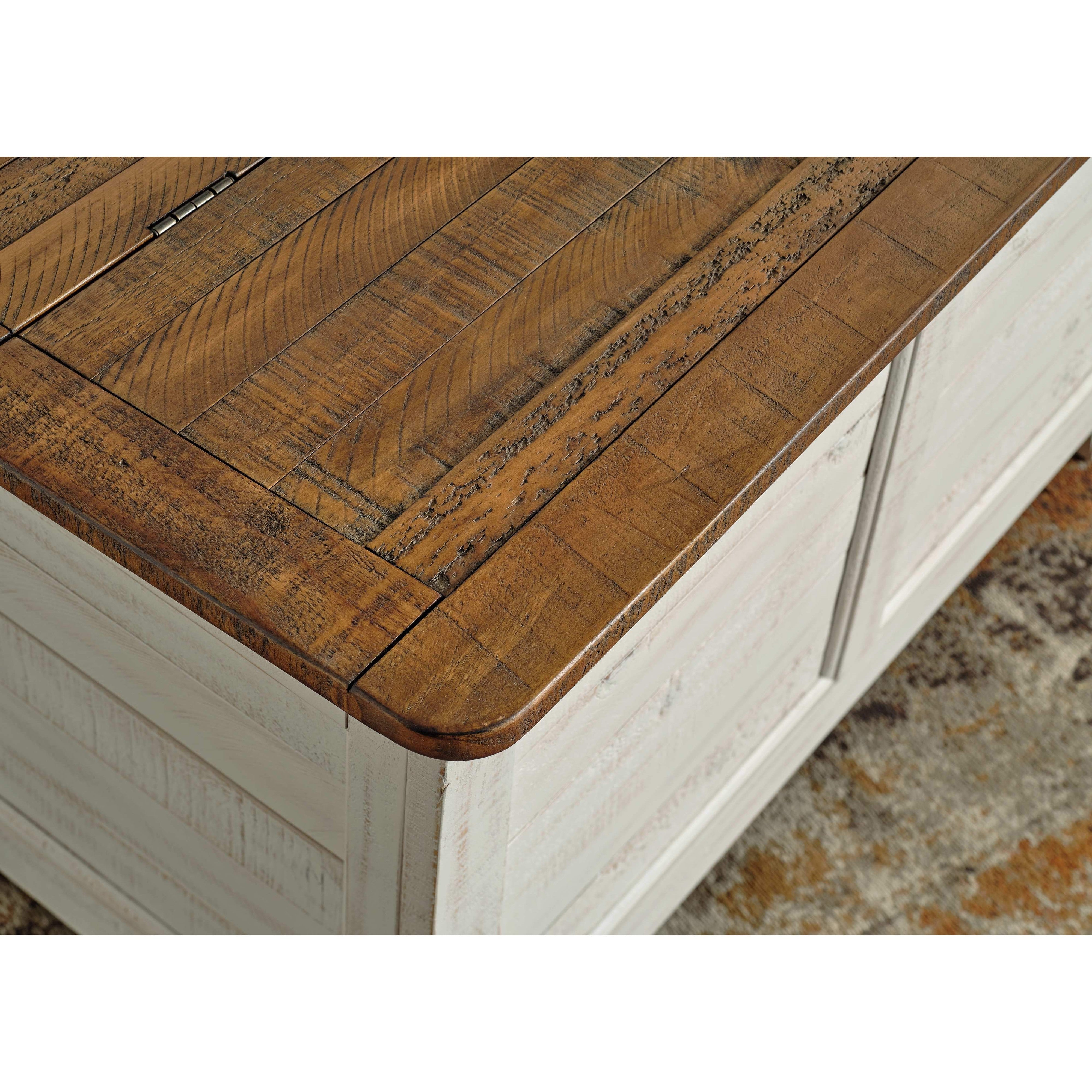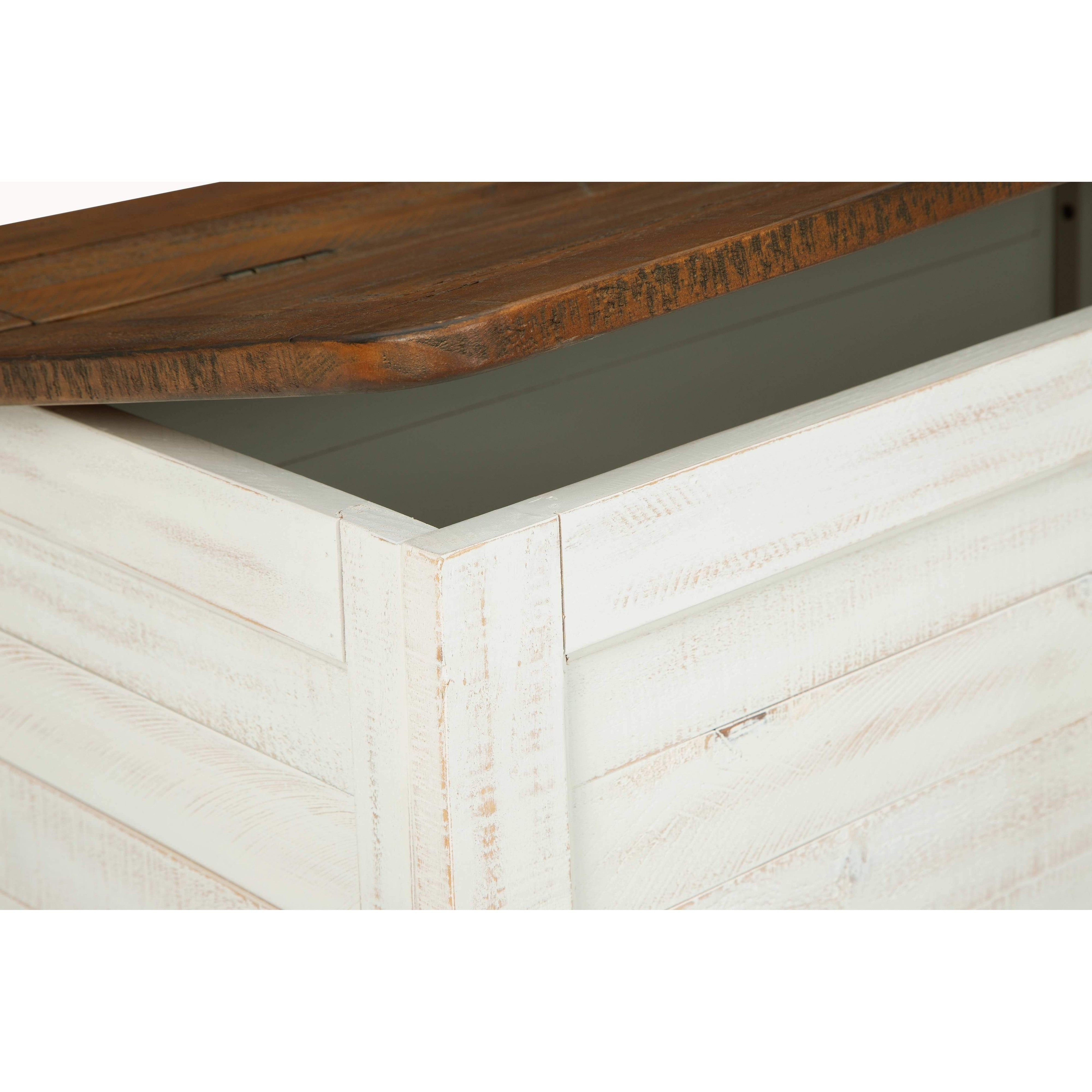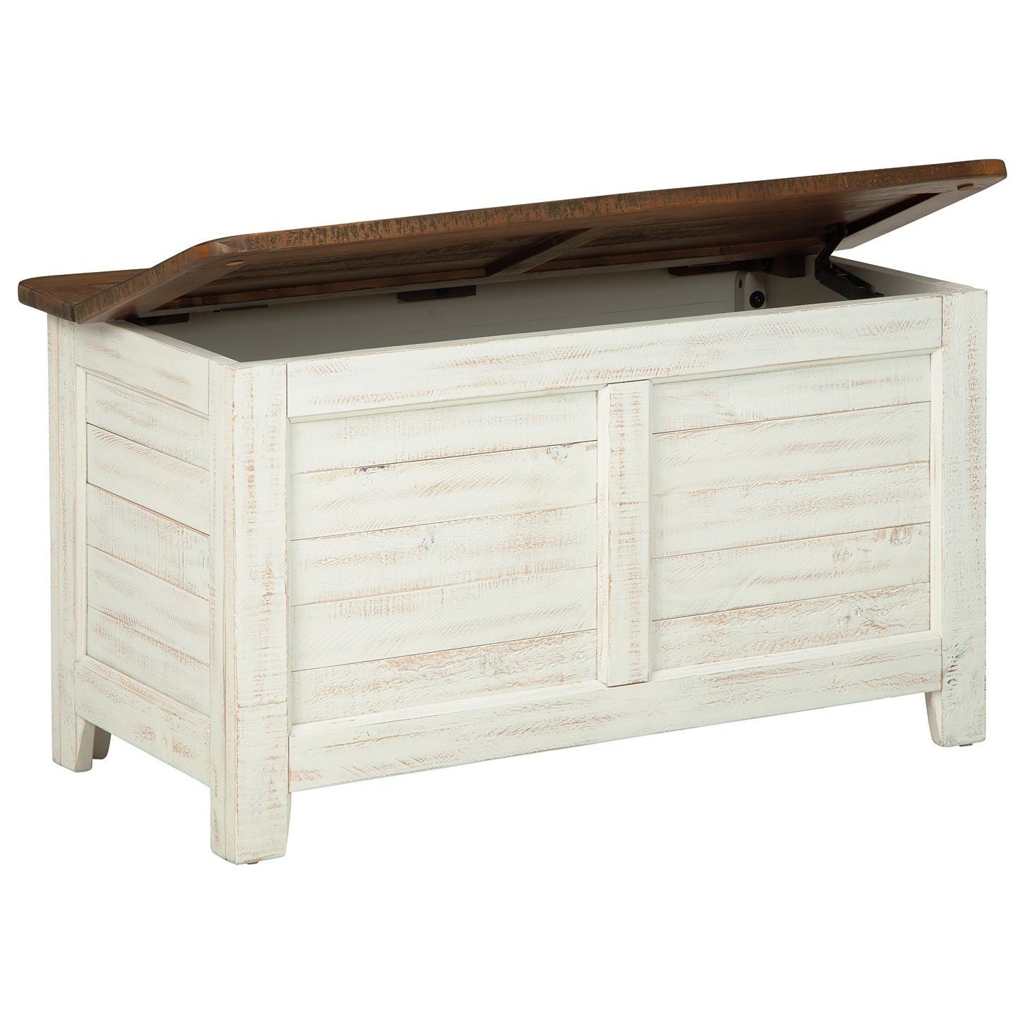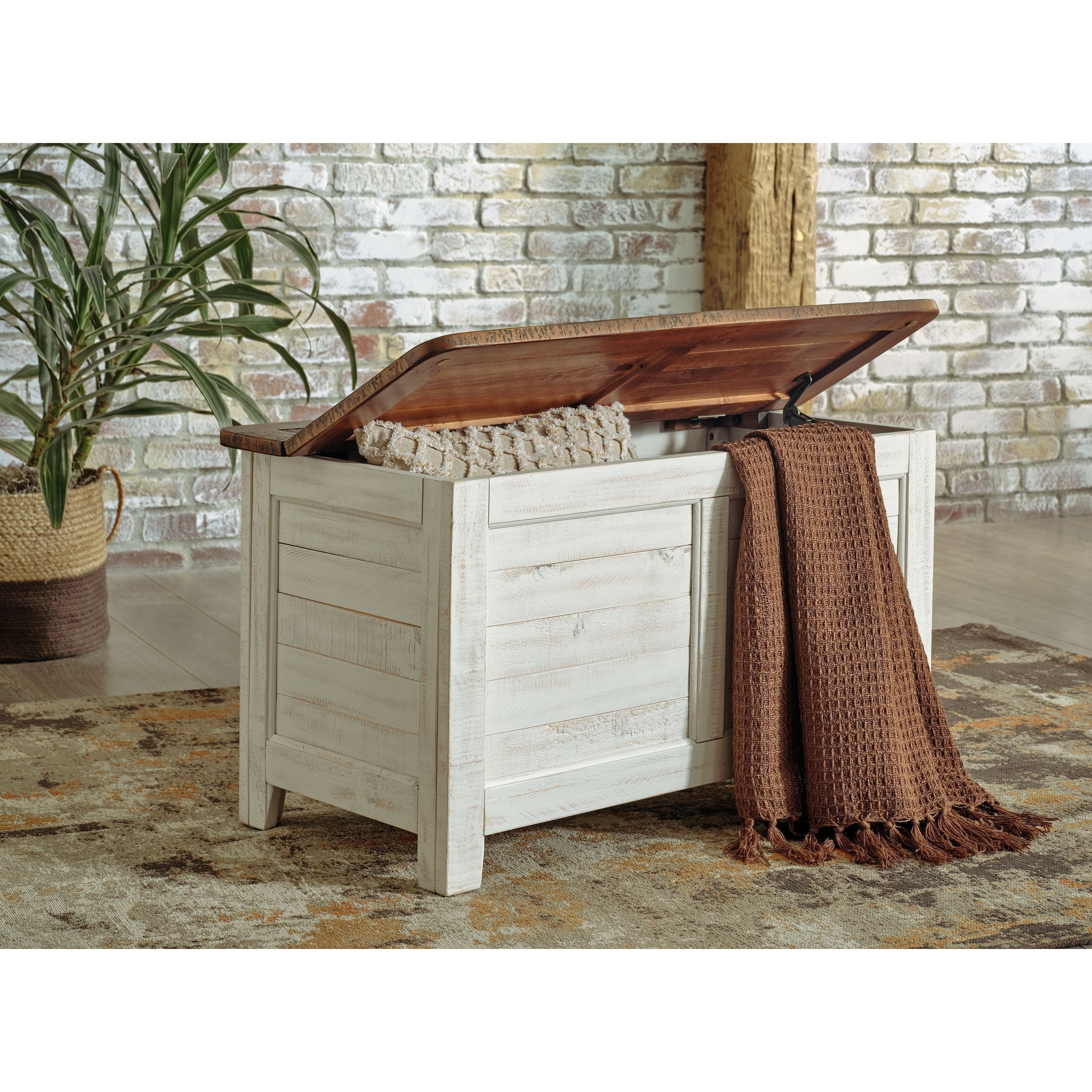 Storage solutions are made simple with this hinged top storage trunk. In distressed brown and white finish, this storage trunk oozes casual glam. A distressed planked effect on the front and sides brings subtle texture that gives this piece a little extra flair.