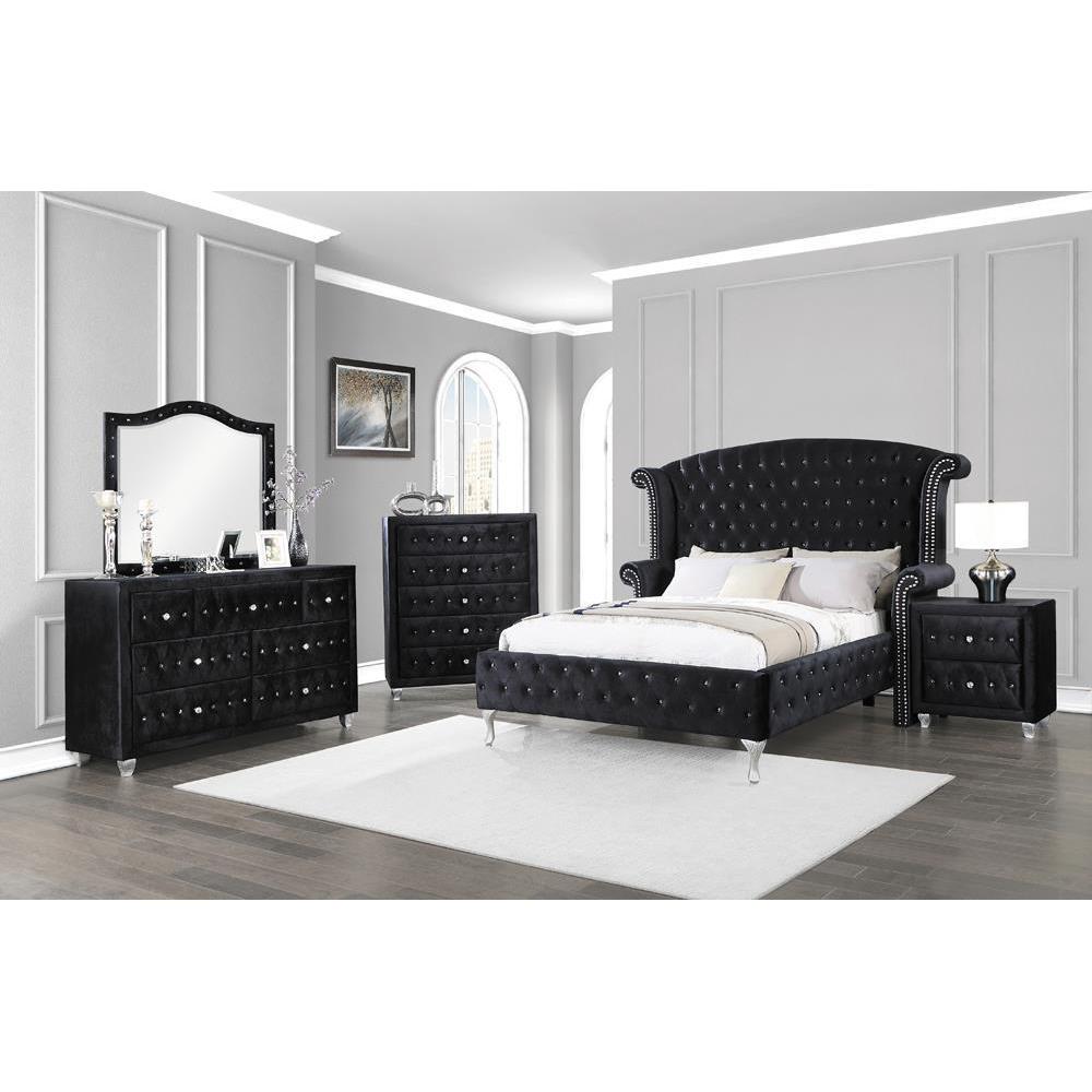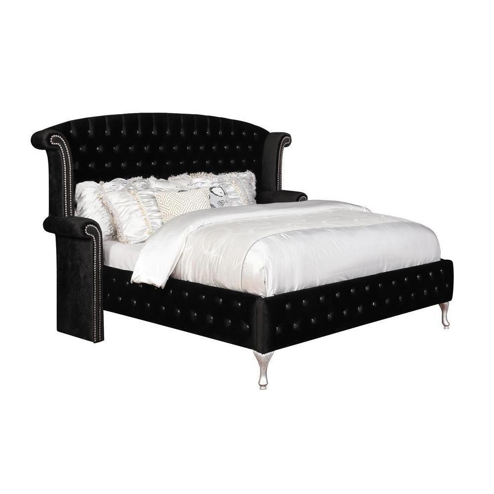 Dress up a bedroom with luxurious glamour. this magnificent queen bed has a truly elegant look. its tall, stately headboard boasts bold, metallic trim. beautiful button tufting adorns its frame, giving it a chic, sophisticated aesthetic. complete with gorgeous black upholstery, this bed makes a stunning statement of style.