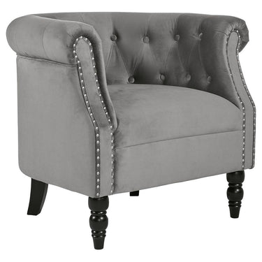 Rounding out your decor while providing sensible seating arrangements in small spaces, side chairs offer style and versatility to any interior design. Adding the statement-making appeal of glam style to your abode, this armchair features a rounded back, two scrolled arms and button-tufted accents around the back. An eye-catching nailhead trim and turned wood legs accent the solid color of the polyester velvet upholstery.