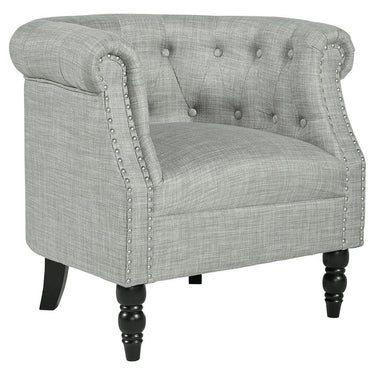 Rounding out your decor while providing sensible seating arrangements in small spaces, side chairs offer style and versatility to any interior design. Adding the statement-making appeal of glam style to your abode, this armchair features a rounded back, two scrolled arms and button-tufted accents around the back. An eye-catching nailhead trim and turned wood legs accent the solid color of the polyester upholstery.