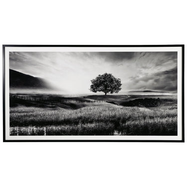 Filled with calming natural elements, this wall art has a refined look with a restful feel. It captures a landscape with rolling hills, drawing your eye to the tree standing tall in the center of the creation. Lighter tones in the clouds bring brightness to the black and white design, making for a striking addition to your modern decor.