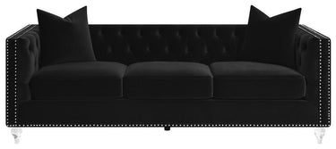 With an iconic tuxedo style design, this contemporary sofa lends a refined look to living rooms and seating areas. classic button tufted interior backrest and arms offer an elegant touch while gleaming individually hammered nailhead trim extends down each straight arm and across the bottom edge. covered in a luxe black velvet that is soft to the touch, this sofa invites you to sit and stay a while. on each arm's exterior is a mitered mirror and acrylic crystal frame inset that offers a striking statement and accent, matched only by turned clear acrylic legs. plush seating and trillium blend-filled accent pillows complete this furniture piece, elevating it to something truly special.