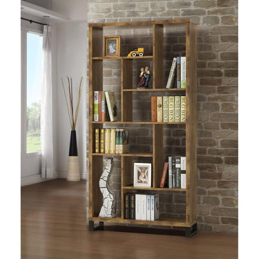 A classic look for classic spaces. show off volumes of books, artistic decor, and potted greenery in a traditional space. this bookcase presents a beautiful and functional addition to a living room or home office. square and rectangular sections accommodate varying heights. finished in antique nutmeg and black, it offers a versatile palette that blends with a variety of settings.