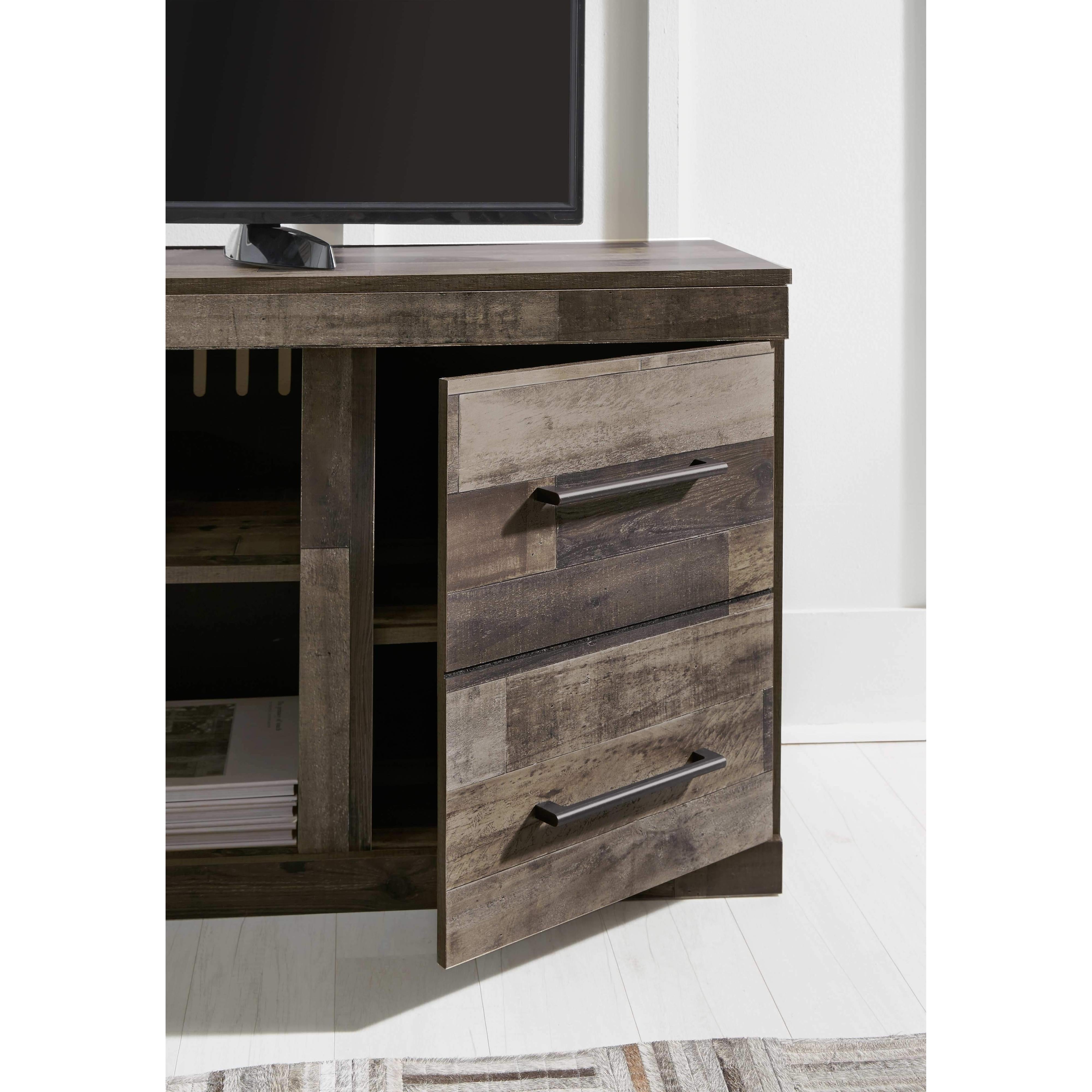 Make this TV stand with fireplace option the center of attention with its urban eclectic style. Its rustic finish over a replicated pine grain creates an authentic natural look for your home entertainment area. You'll love its functionality. Open and closed-door storage with adjustable shelving accommodates media needs.