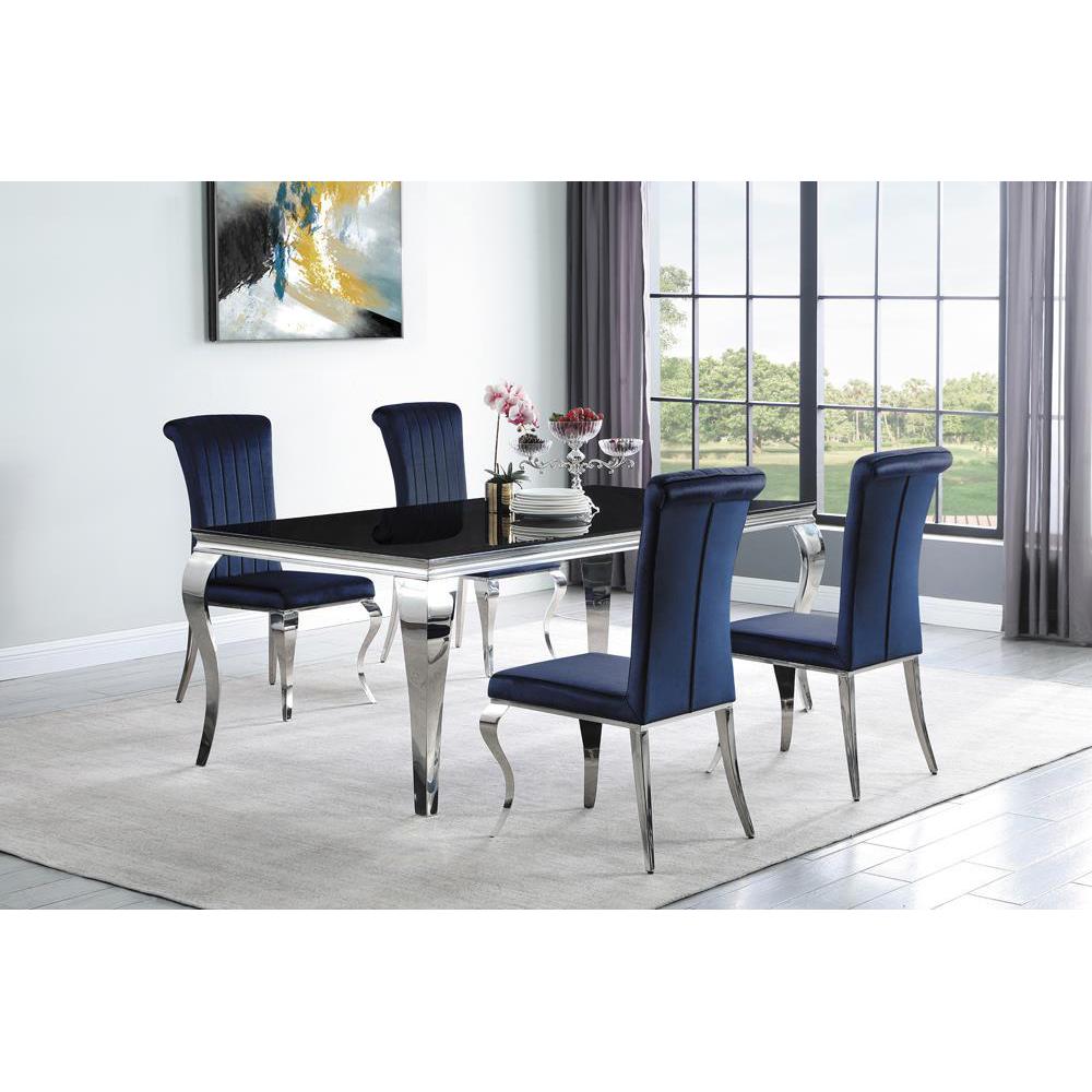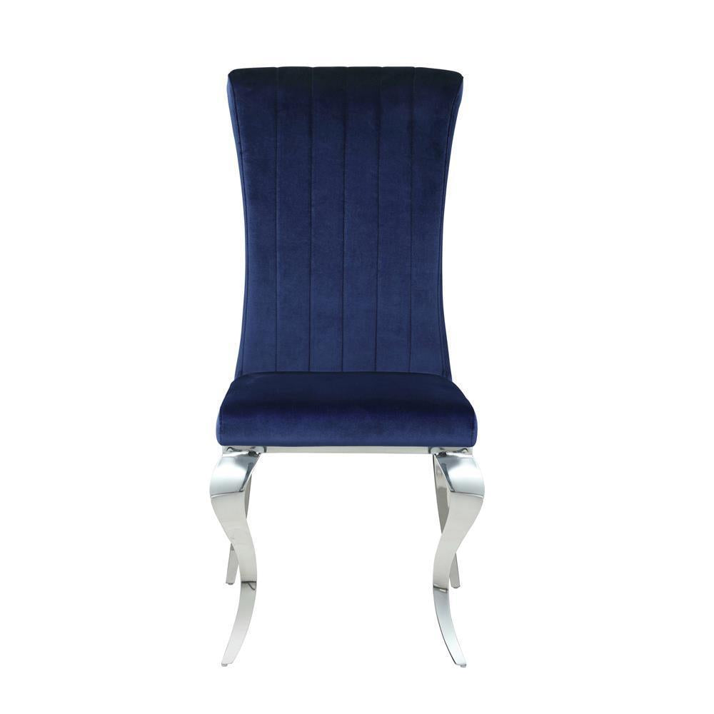 Elegant and ultra-glamorous, this upholstered dining chair offers a mixed material design that is made to last and perfect for formal dining rooms. each chair features a stainless steel base and legs with a gleaming, shiny chrome finish. cabriole-inspired curved legs in front add a traditional flair. sit back and relax into channel tufted upholstery, complete with a tall backrest that rolls toward the top. wrapped in a plush velvet fabric, these chairs are inviting and soft to the touch, and are offered in four different colors to accompany the carone collection dining table.