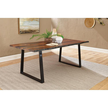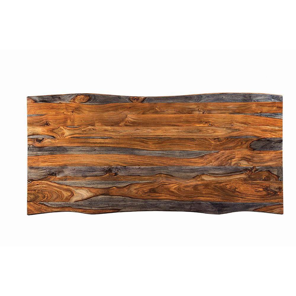 Revel in the light, airy design influence of this wood and metal dining table. grey shishum wood finishing ensures a rich, dimensional look perfect to elevate any dining space. a wide rectangular tabletop is perfect for seating six for a scrumptious holiday meal or a leisurely chat over dessert and a nightcap. the base of the table features a pair of metal braces in a black finish that offers lovely contrast. the open nature of the table's base preserves it's open beauty and elegance.