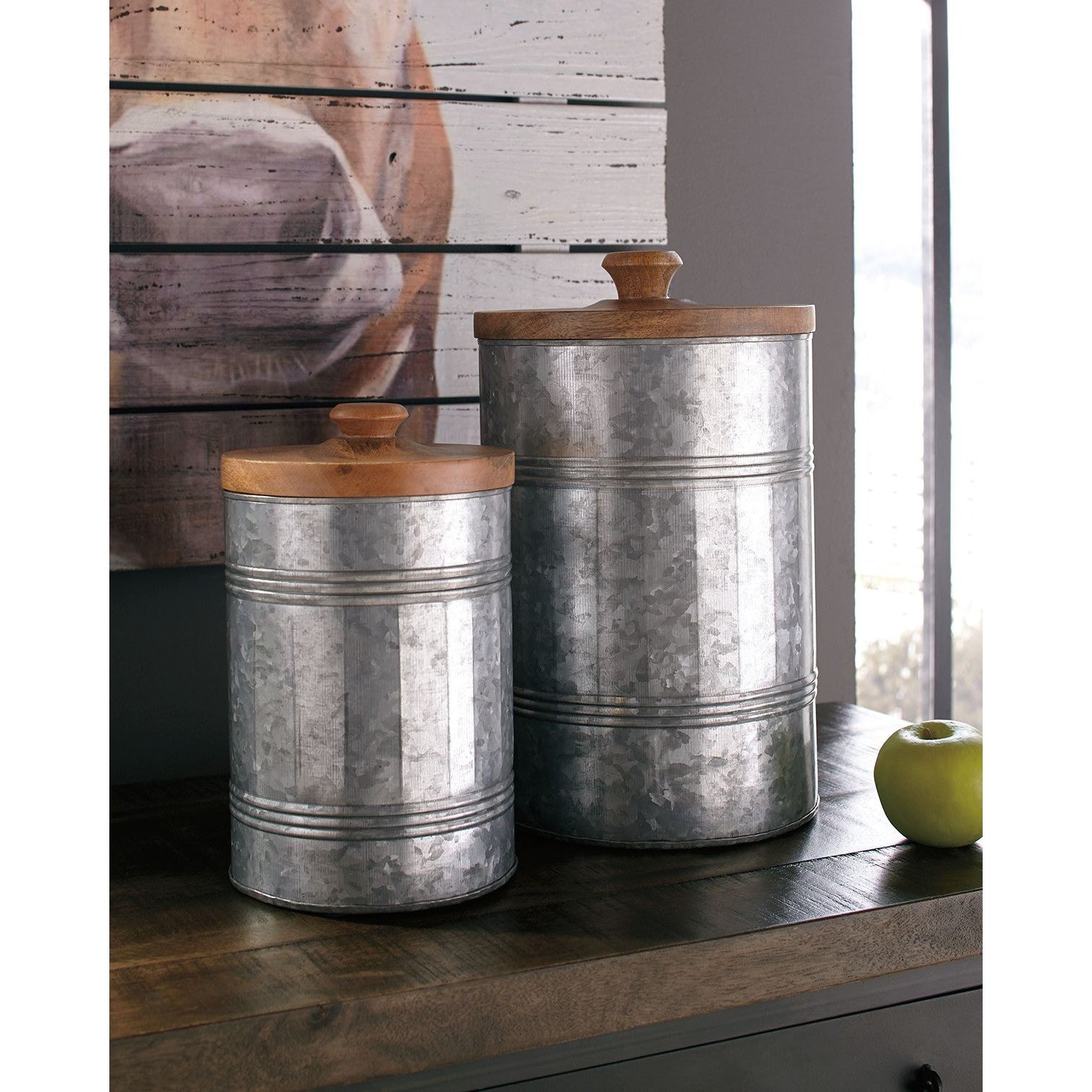 Keep your items stylishly hidden with this 2-piece jar set. Natural finished wood and antique galvanized metal give these jars industrial farmhouse appeal. Impressive sizes make them ideal for storage.
