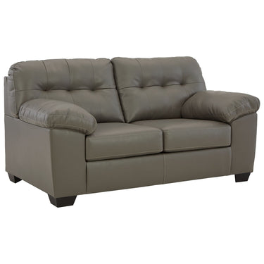 Dressed in glorious gray faux leather, this loveseat is certain to be the center of attention. With tasteful tufting, padded armrests and a sleek tapered design, it combines style and comfort. This loveseat's generous scale lets you kick back and relax at home solo or when hosting friends.