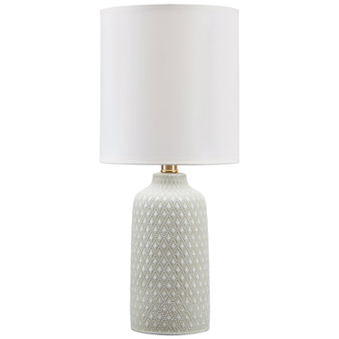 Add a casual modern look to your home with this stunning contemporary table lamp. Its textured body is accented with a raised diamond pattern of clean lines and grooves, while brass-tone fittings provide a glamorous touch. Paired with a white fabric drum shade, this ceramic lamp is striking in transitional to contemporary environments.