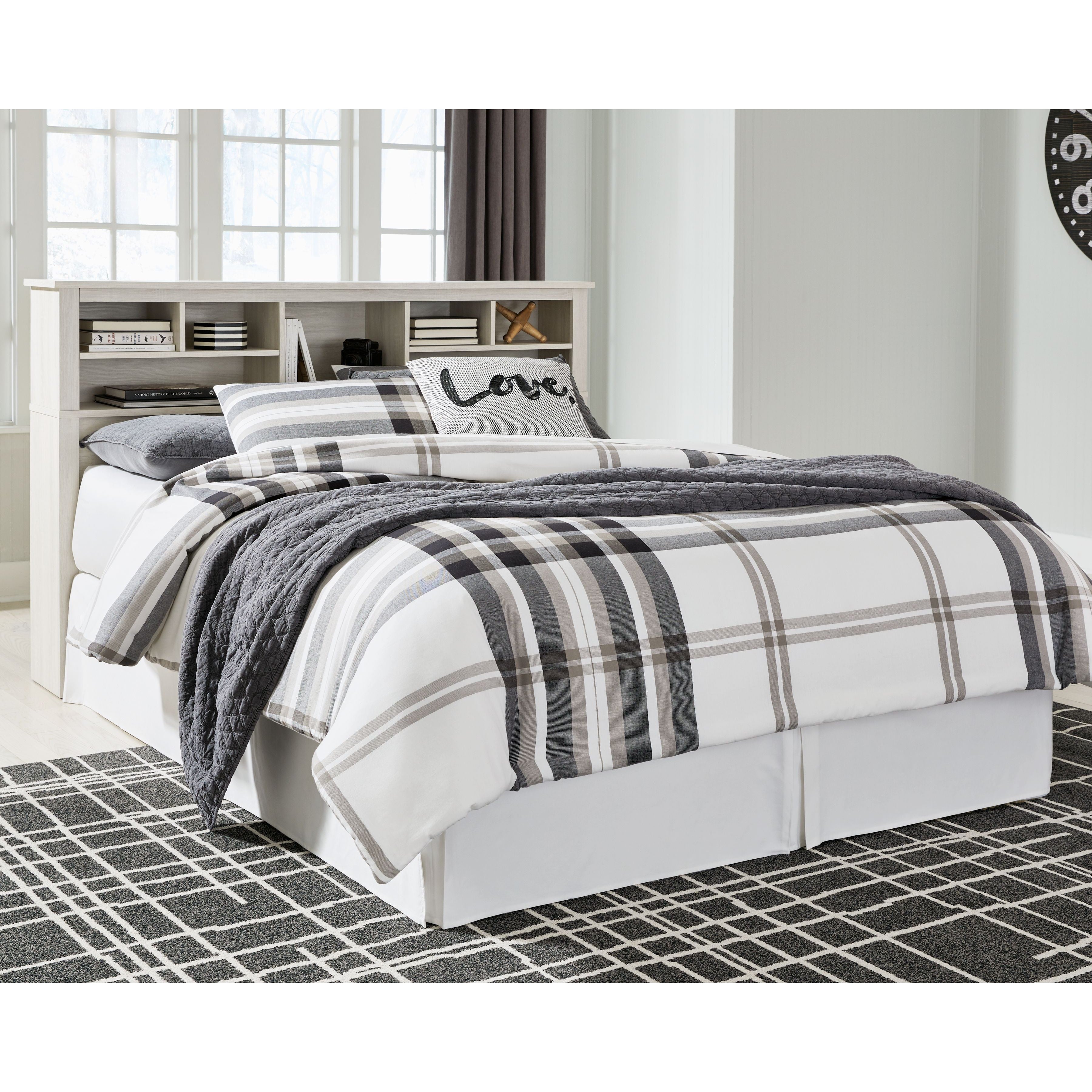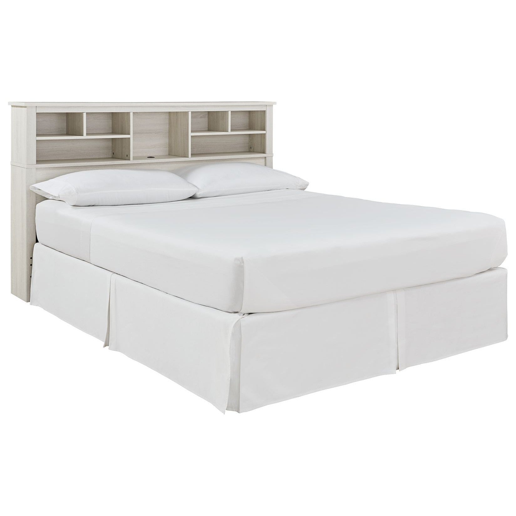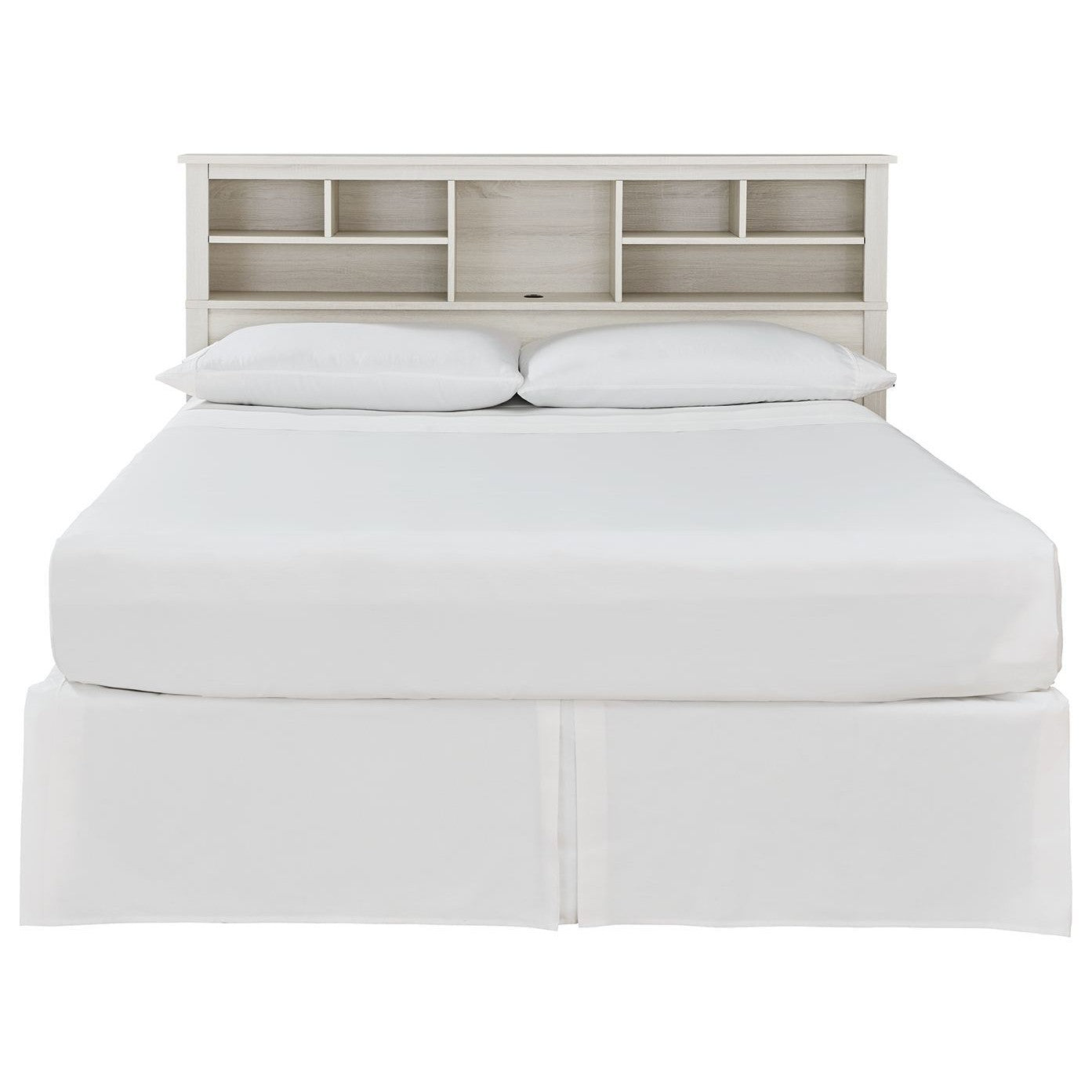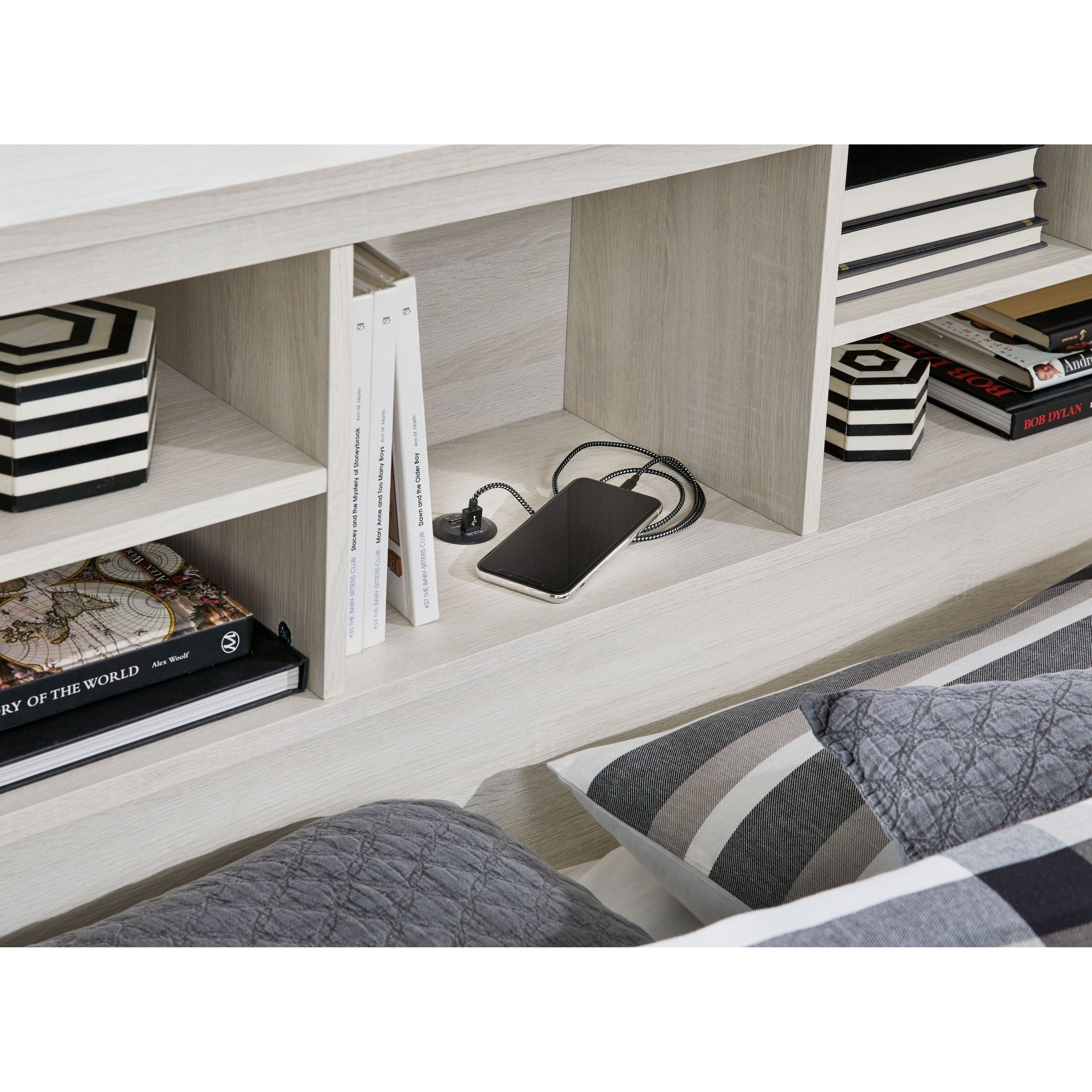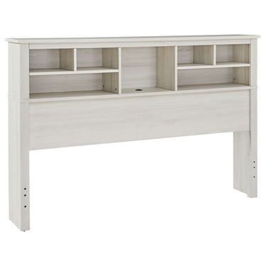 Clean lines and a crisp white finish add light to your room with this king/California king storage headboard. Multiple open shelves allow for versatile storage or display options, and the dual USB charging port in the center cabinet upgrades this headboard to a functional favorite.