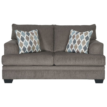 This contemporary loveseat has comfort written all over it. From the plush cushions to the textured gray fabric, it's a total winner for relaxation. The patterned throw pillows in blue, brown and tan complement the richly neutral upholstery.