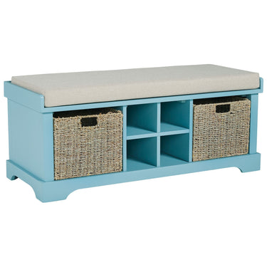From providing spare seating to storing shoes and more, this storage bench is a must-have in any abode. Two open cubbies accommodate woven wicker baskets (included) to store everything from blankets to toys, while the upholstered seat cushion is filled with comfortable padding for extra support.