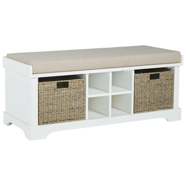 From providing spare seating to storing shoes and more, this storage bench is a must-have in any abode. Two open cubbies accommodate woven wicker baskets (included) to store everything from blankets to toys, while the upholstered seat cushion is filled with comfortable padding for extra support.
