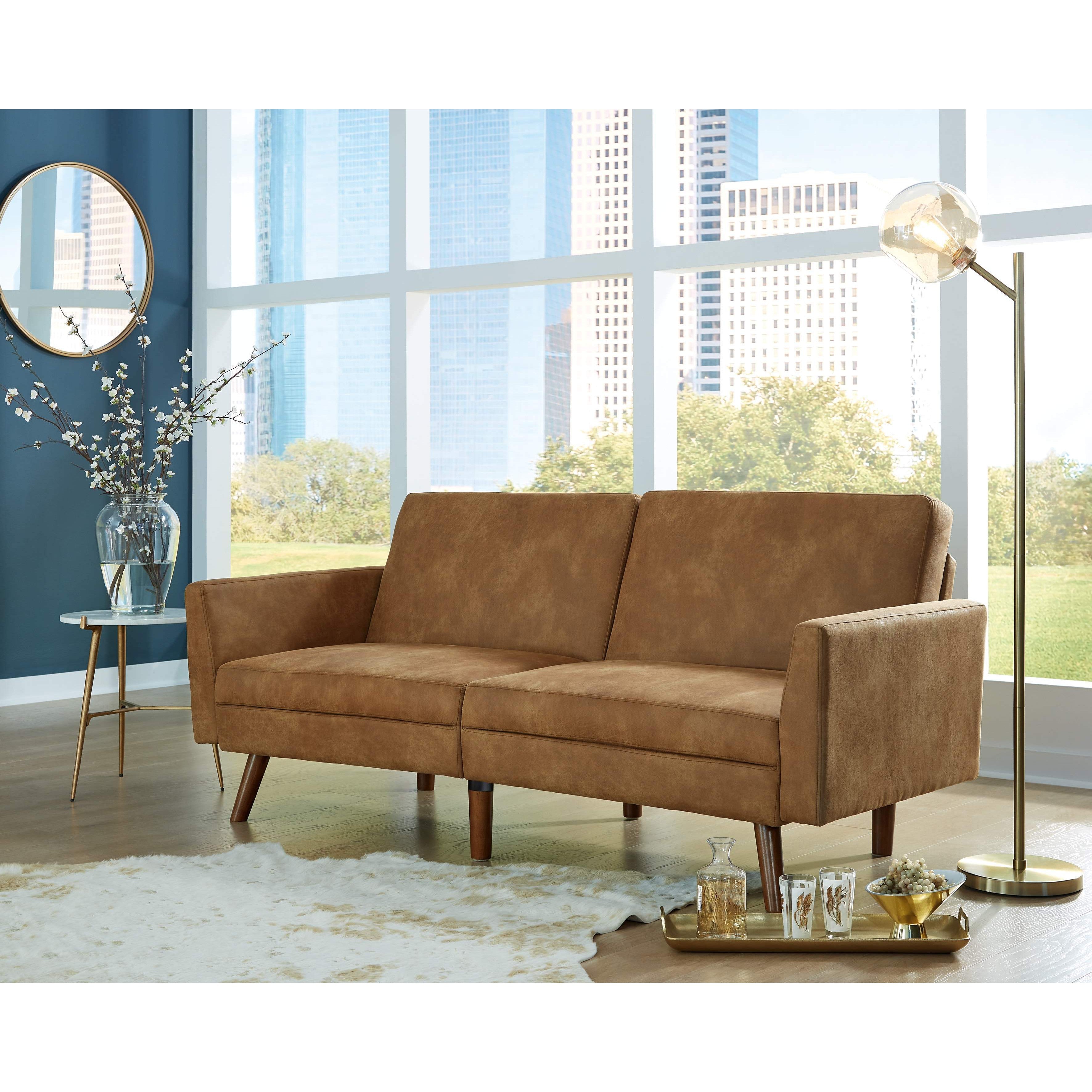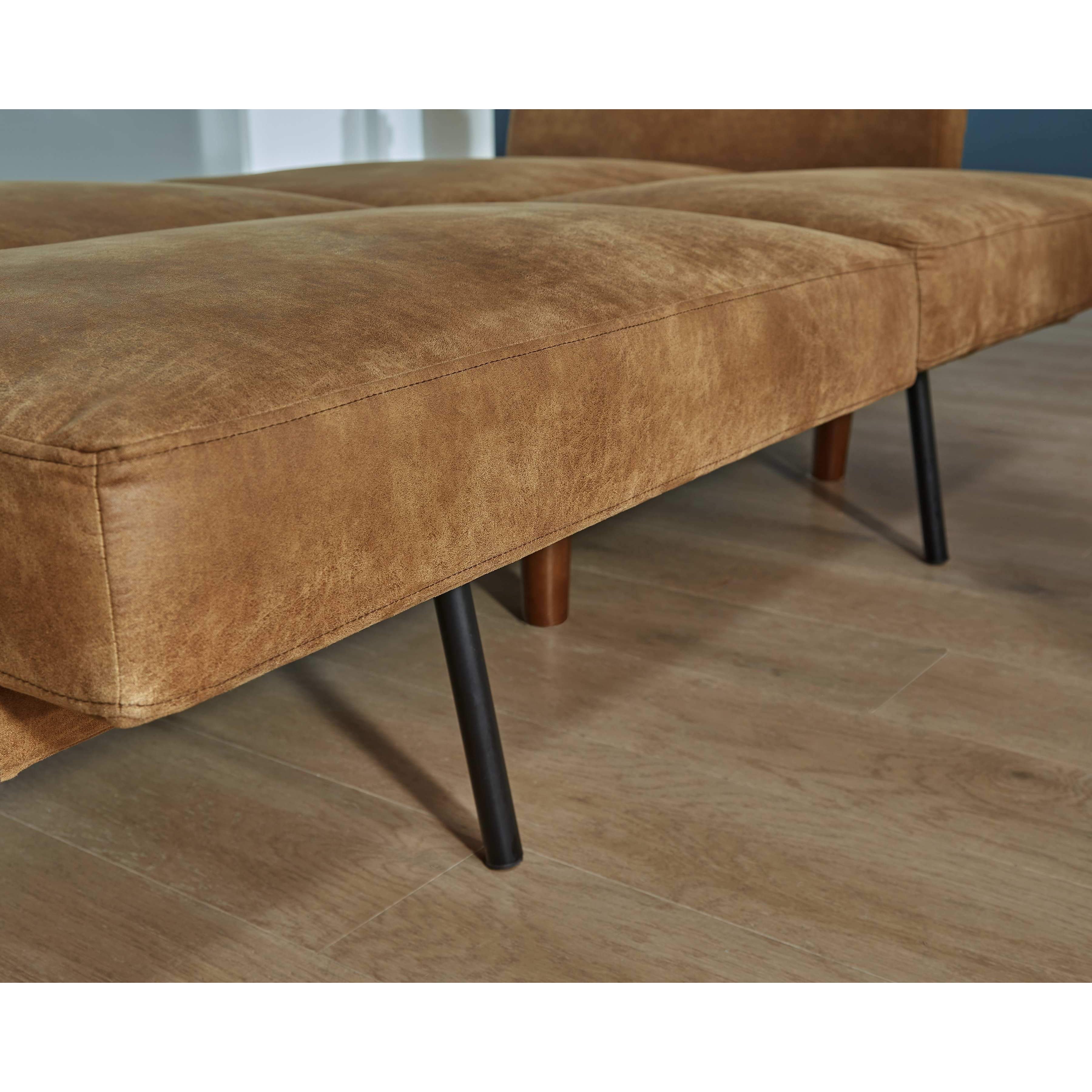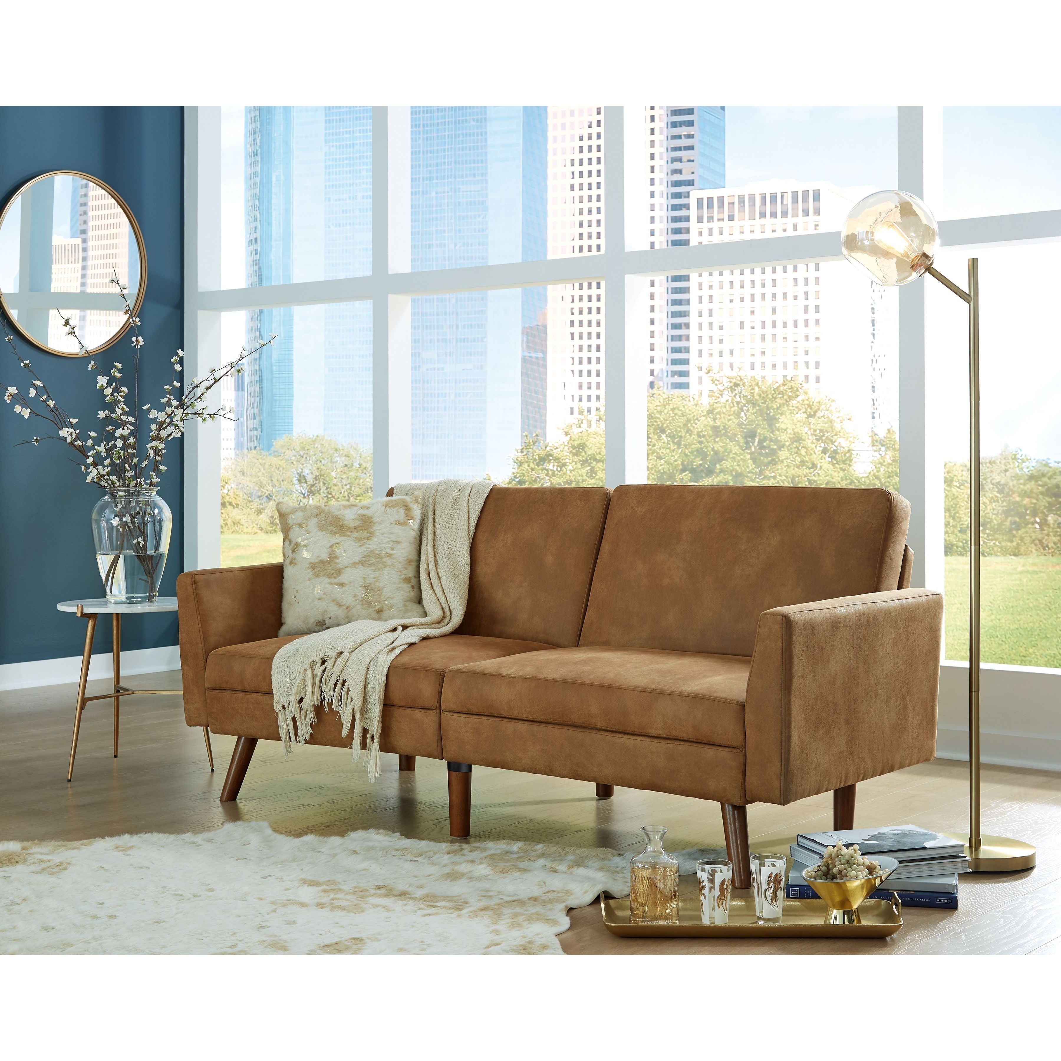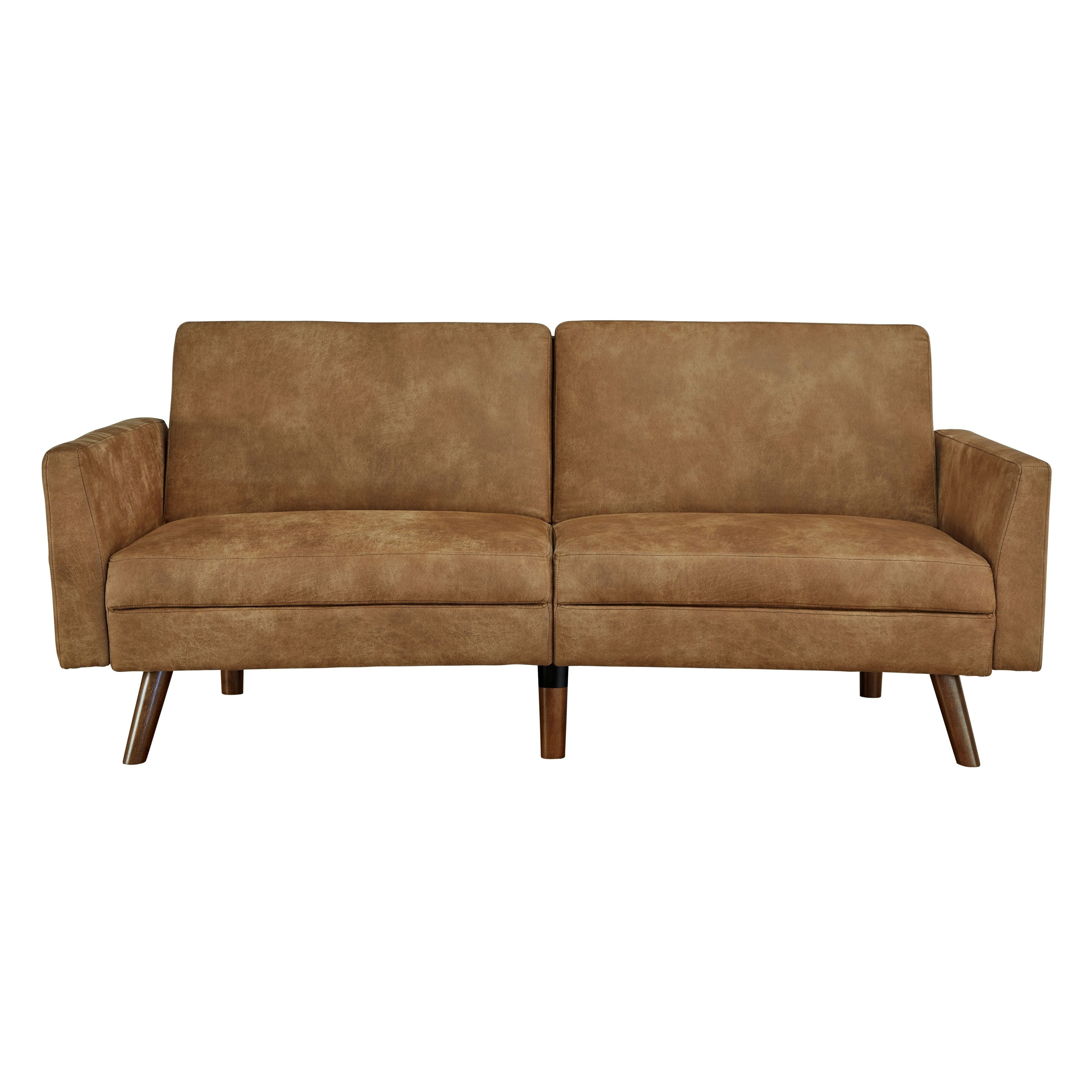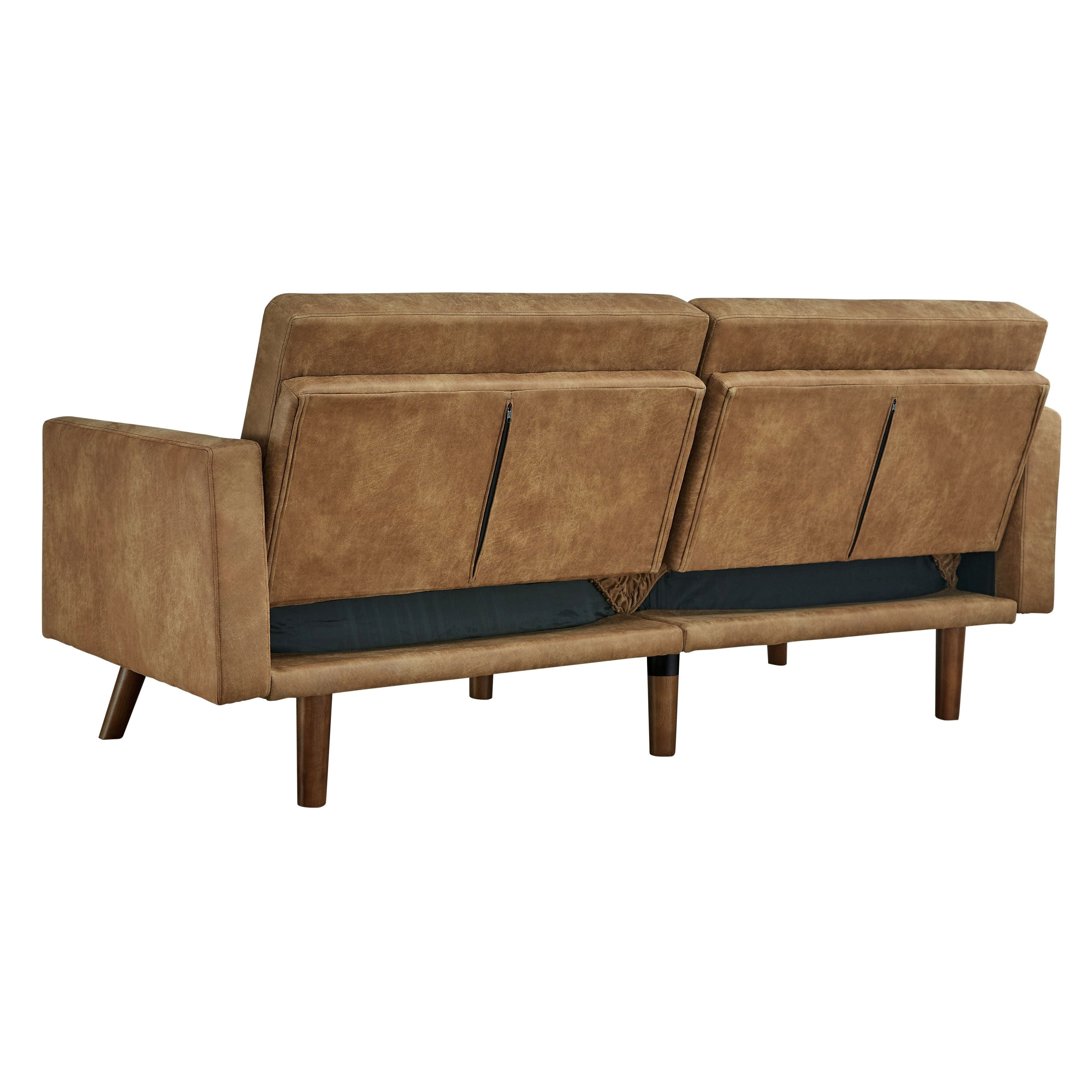 No room at the inn? This versatile flip flop sofa accommodates your overnight guests, as well as your love of clean-lined, modern style. Wrapped in a fabulous caramel-colored faux leather rich with tonal variation for a sense of authenticity, this chic futon/sofa is dressed to impress with slim track arms, a 2-over-2 box cushion design and tapered legs with a faux wood finish. This versatile sofa easily makes itself at home in a main living room if space is limited and can be used as a sofa sleeper in a guest room, rec room or finished basement. The back fully reclines to ensure a good night's sleep.