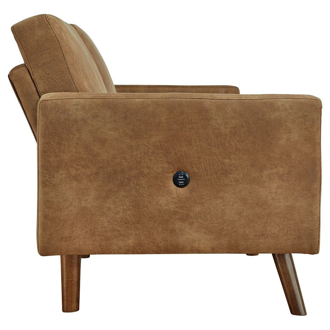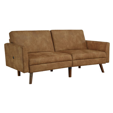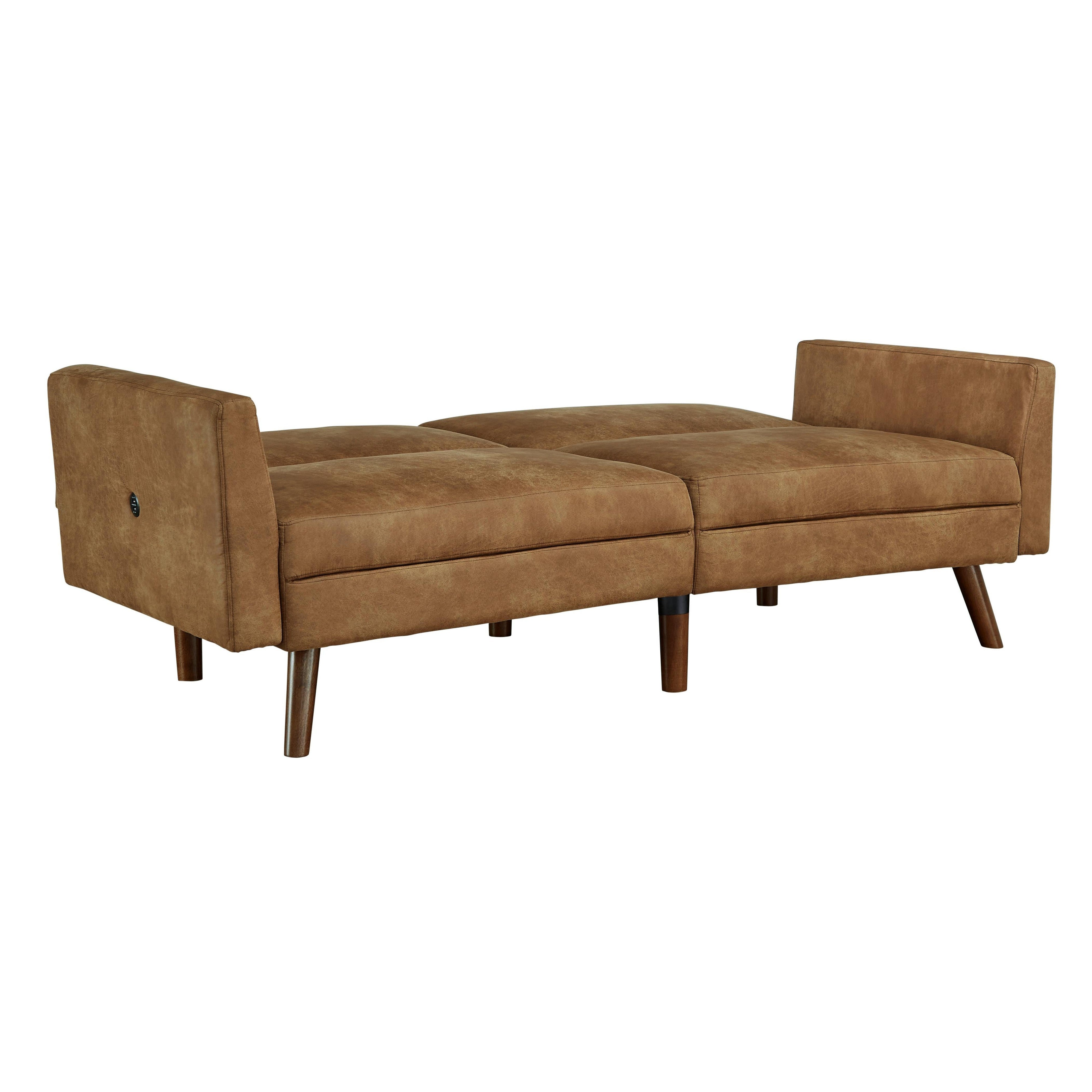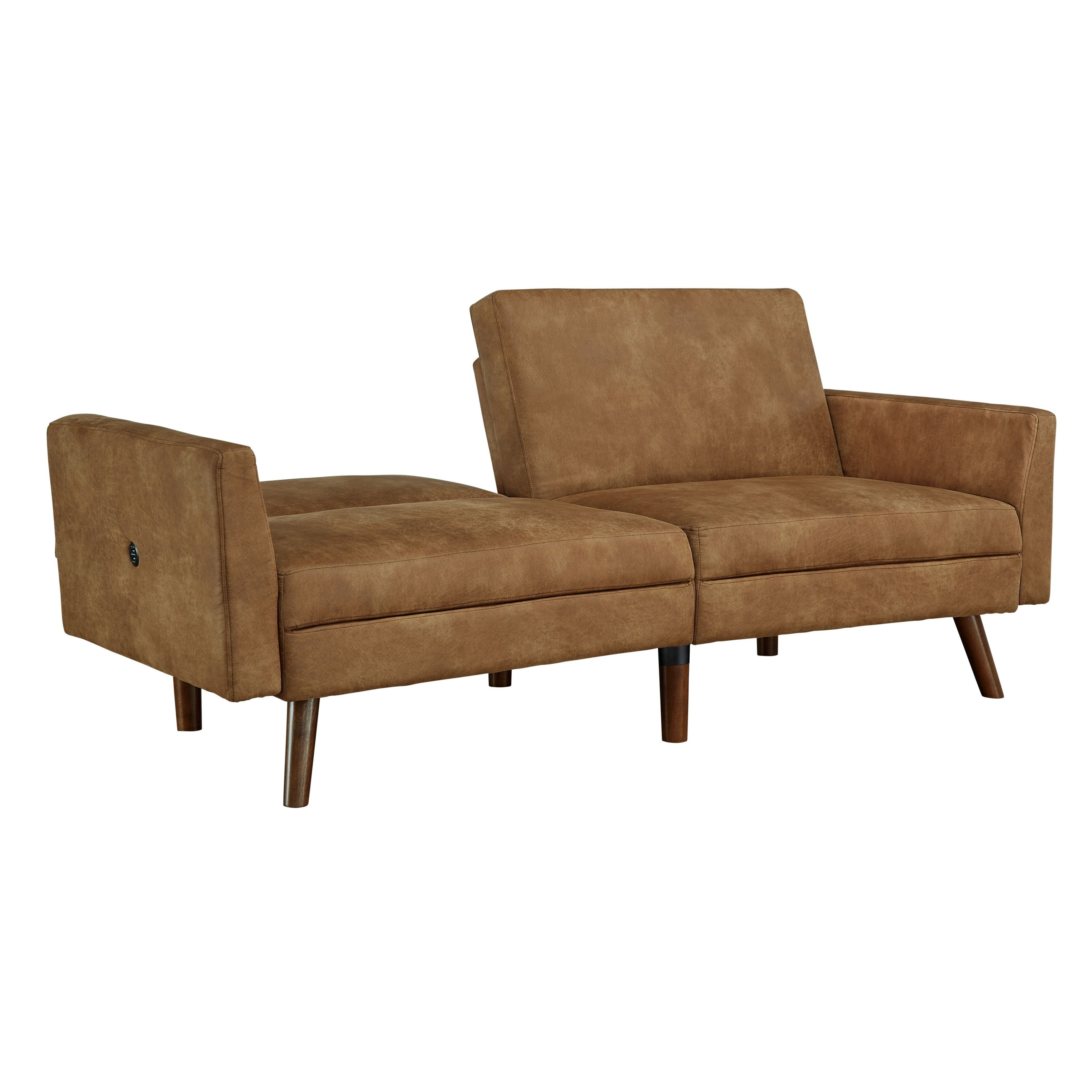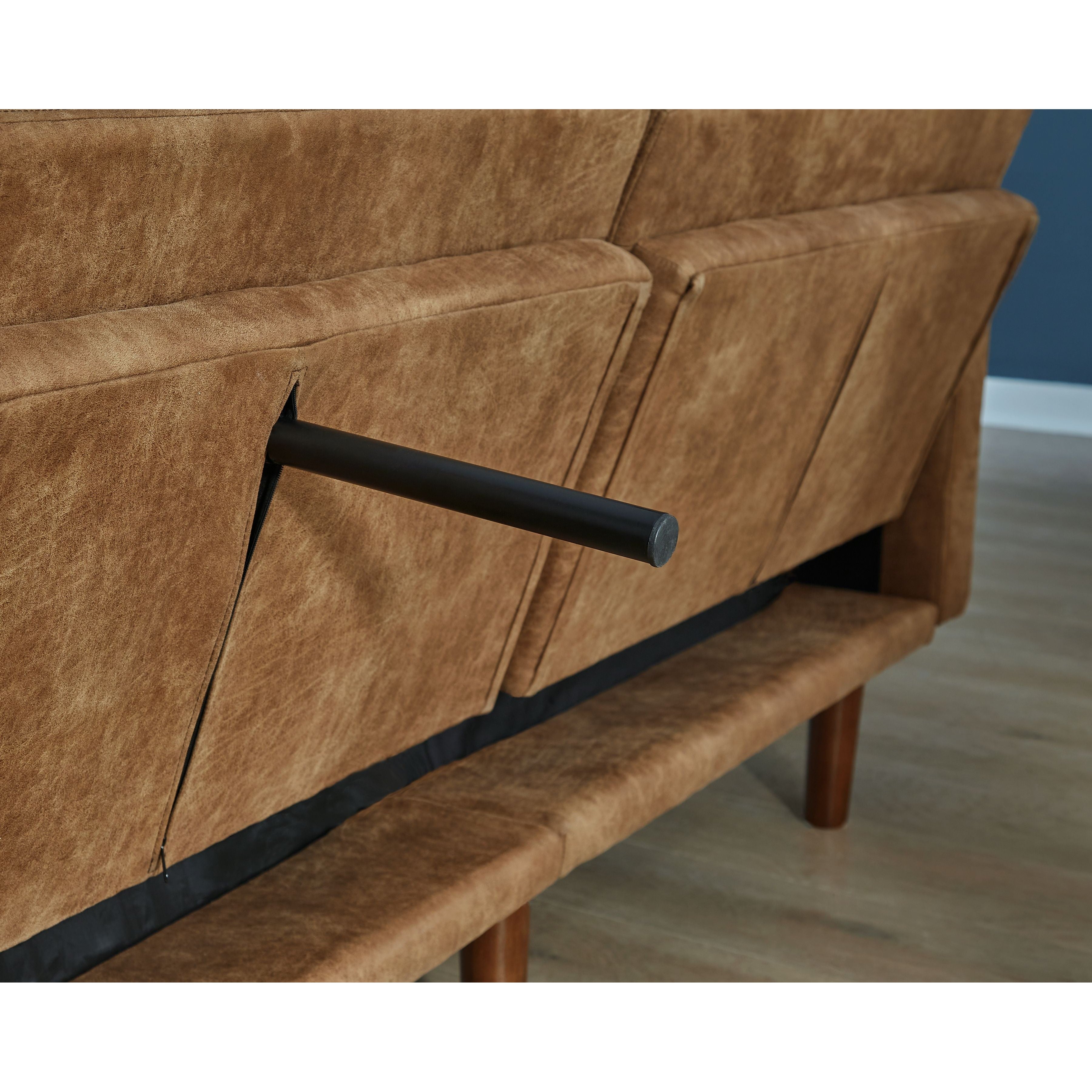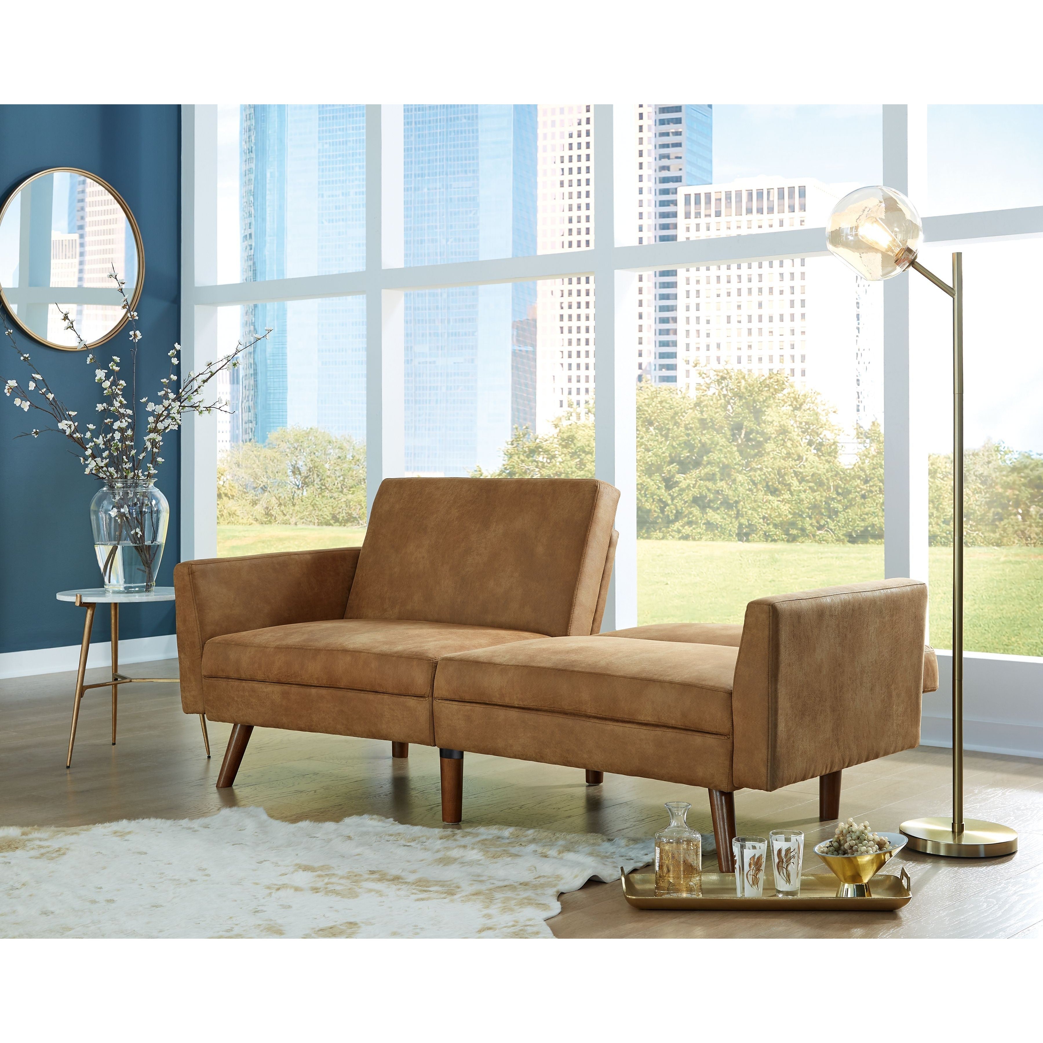 No room at the inn? This versatile flip flop sofa accommodates your overnight guests, as well as your love of clean-lined, modern style. Wrapped in a fabulous caramel-colored faux leather rich with tonal variation for a sense of authenticity, this chic futon/sofa is dressed to impress with slim track arms, a 2-over-2 box cushion design and tapered legs with a faux wood finish. This versatile sofa easily makes itself at home in a main living room if space is limited and can be used as a sofa sleeper in a guest room, rec room or finished basement. The back fully reclines to ensure a good night's sleep.