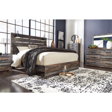 Burnt orange and teal colors accent a brown rustic finish in a replicated woodgrain with authentic touch. Large scaled dark colored handles. Cases feature a framed front and pilasters. All panel headboards (53,57,58,87) feature decorative matte black sconce lights. Side roller glides for smooth operating drawers. All panel headboards (53,57,58,87) can attach to a bolt-on metal bed frame B100-31 or B100-66 respectively. Drawers lined with a faux linen laminate for a clean, finished look. Slim profile dual USB chargers located on the back of the night stand top and the side of the headboards. All side storage options (50,150,60,160) requires the use of the B100-11, B100-12, B100-13 or the B100-14 roll slats. All under bed storage units (50,150,60,160) accommodates to 10.5"W x 10.5"D x 11"H cube storage bins. LED lights accent bookcase headboards (65,69,85). All beds have a panel footboard (52,84,54,56) and storage footboard option (52S,84S,54S, 56S). Queen (65) and king (69) headboards can attach to a bolt-on metal bed frame B100-31 or B100-66 respectively. Queen (65) bookcase headboard is capable of attaching a full sized metal bolt on bed frame. Full (85) headboard can attach to a bolt-on metal bed frame B100-21. Safety is a top priority, clothing storage units are designed to meet the most current standard for stability, ASTM F 2057 (ASTM International). Drawers extend out to accommodate maximum access to drawer interior while maintaining safety.