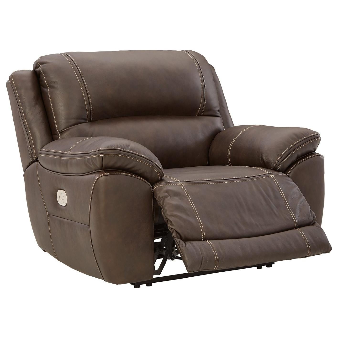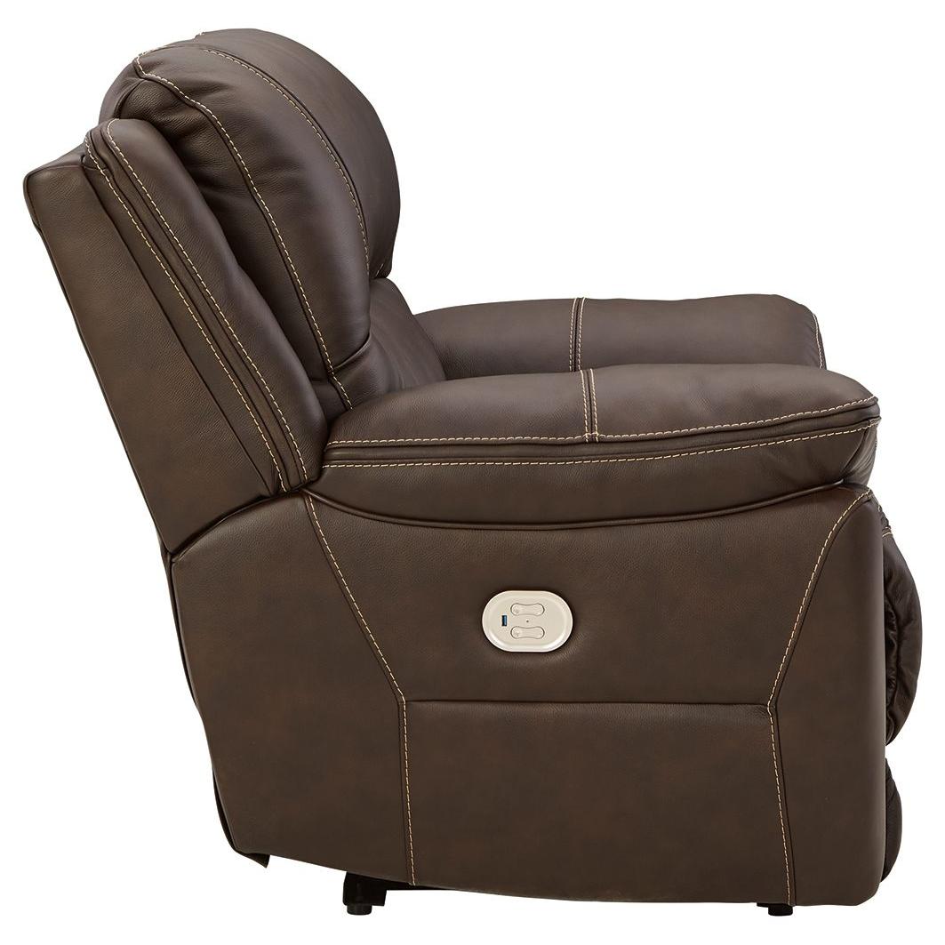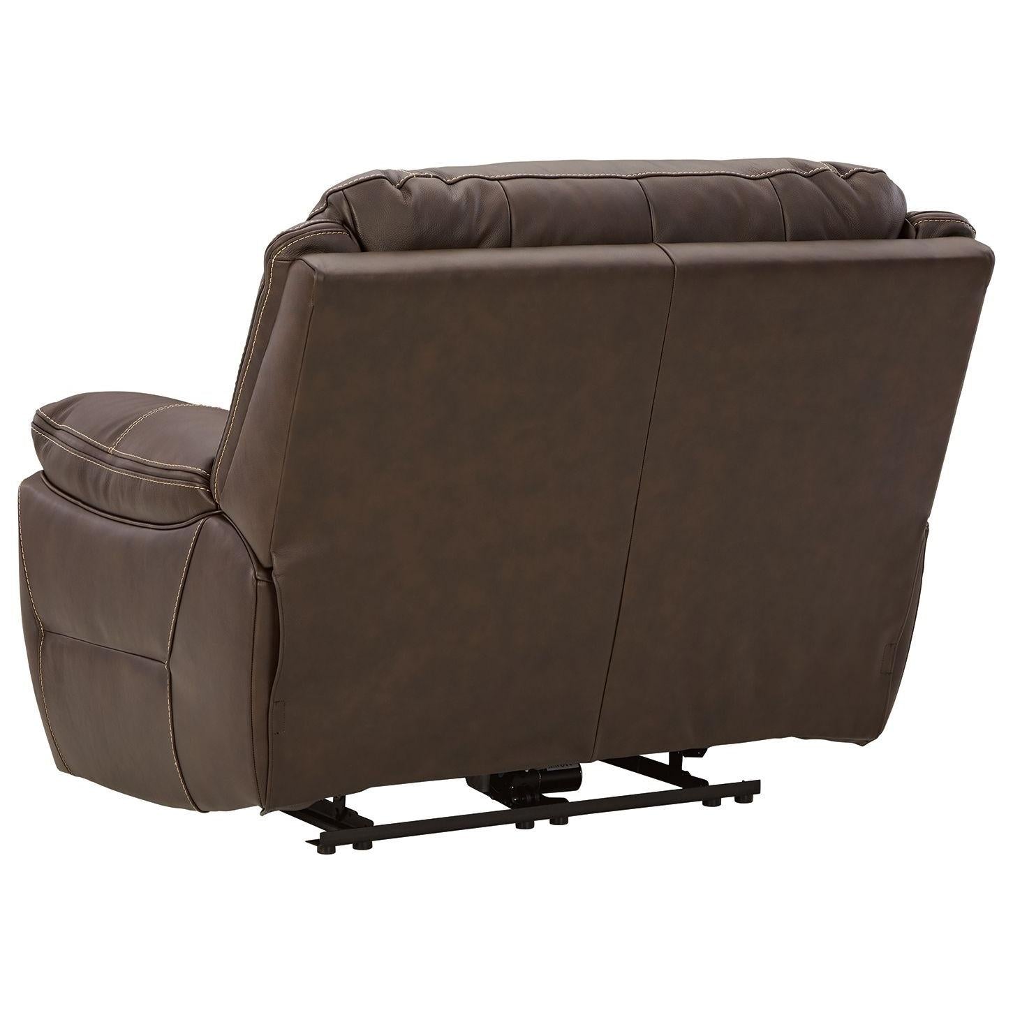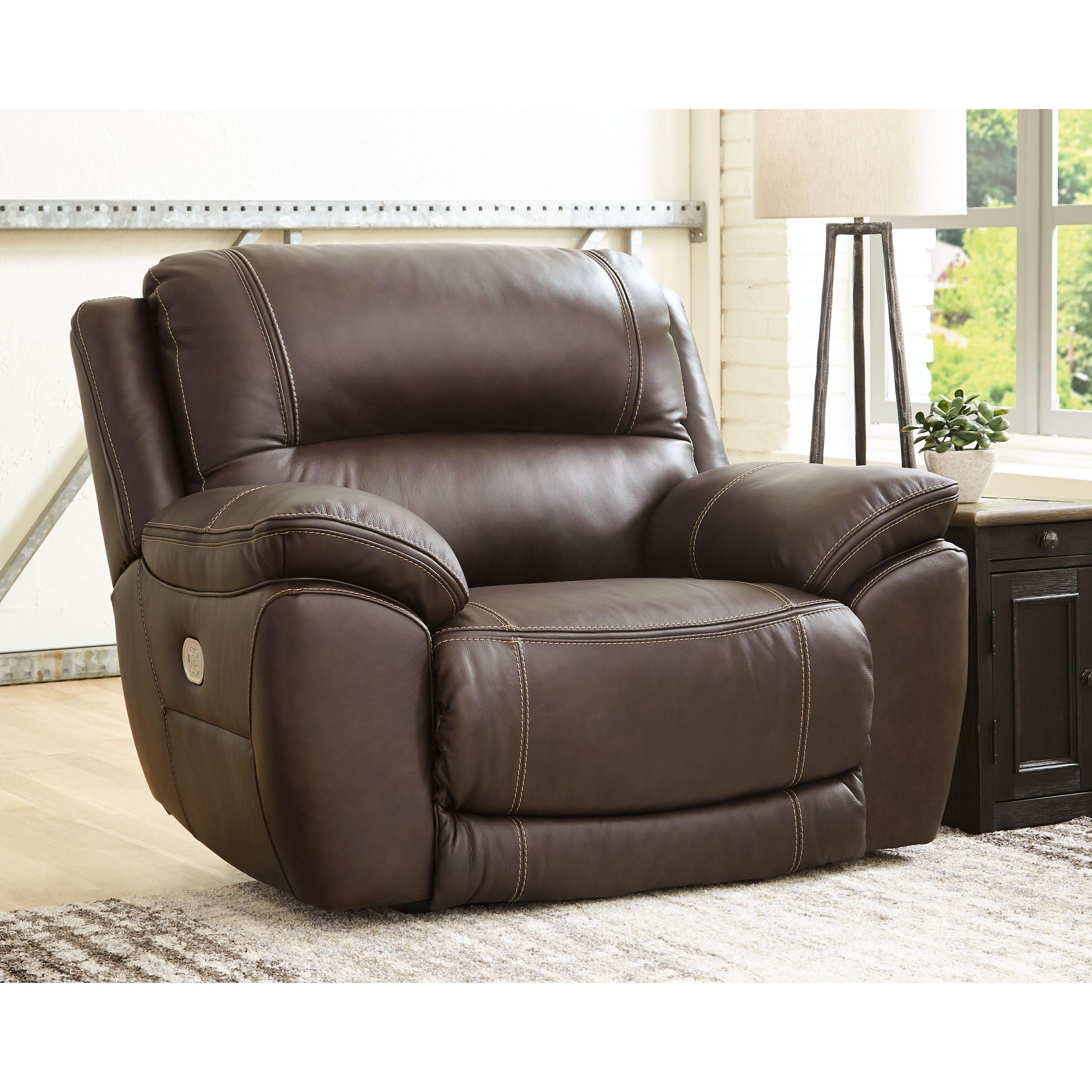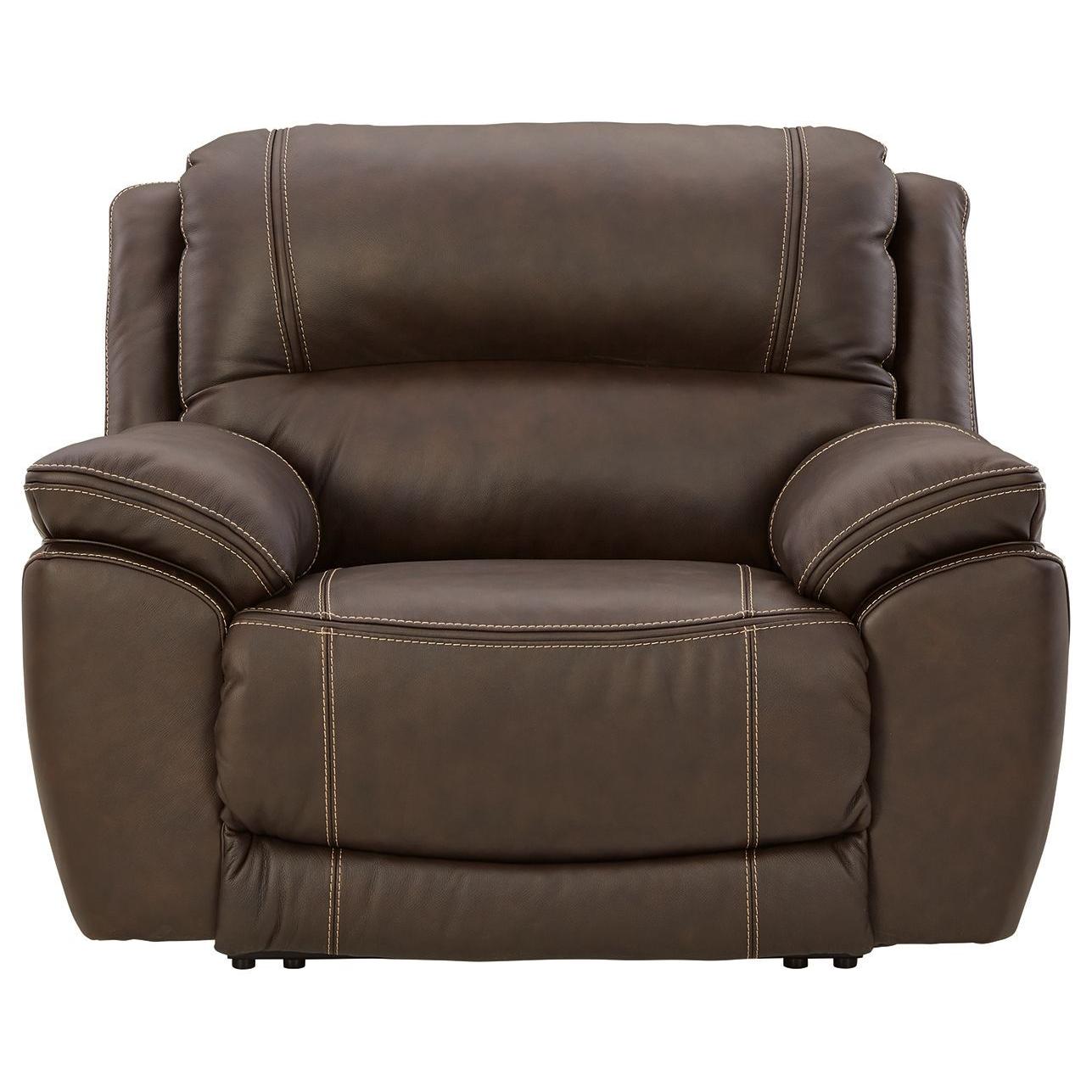 Load up on comfort in a cool, clean-lined and contemporary way with the Dunleith zero wall recliner with power headrest in chocolate brown. Rest assured, you'll enjoy the feel of real leather everywhere your body touches (real leather interior seating/matching faux leather exterior). With a wonderfully soft hand, the heavyweight material is enriched with a pebble grain effect for authentic appeal and enhanced with jumbo stitching for dramatic contrast. It features a one-touch power control with adjustable positions and includes an Easy View� adjustable headrest that allows a primo view of the TV even when you're reclined. The extended ottoman provides extra length for leg comfort. A zero-draw USB plug-in at your fingertips lets you charge up as you chill out.