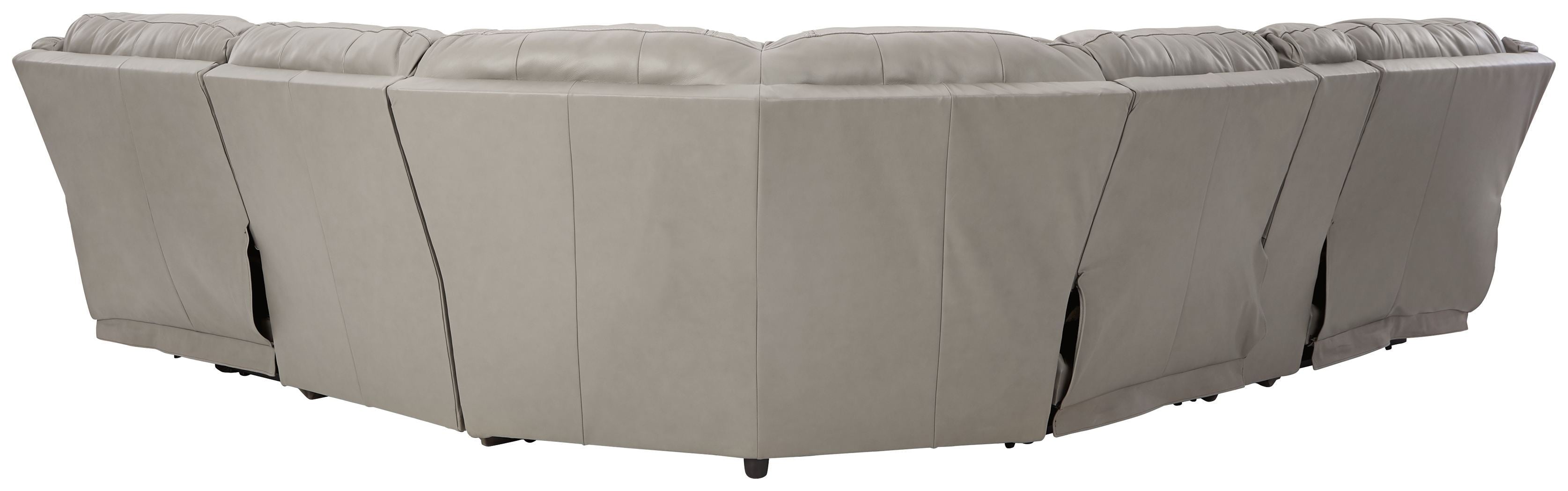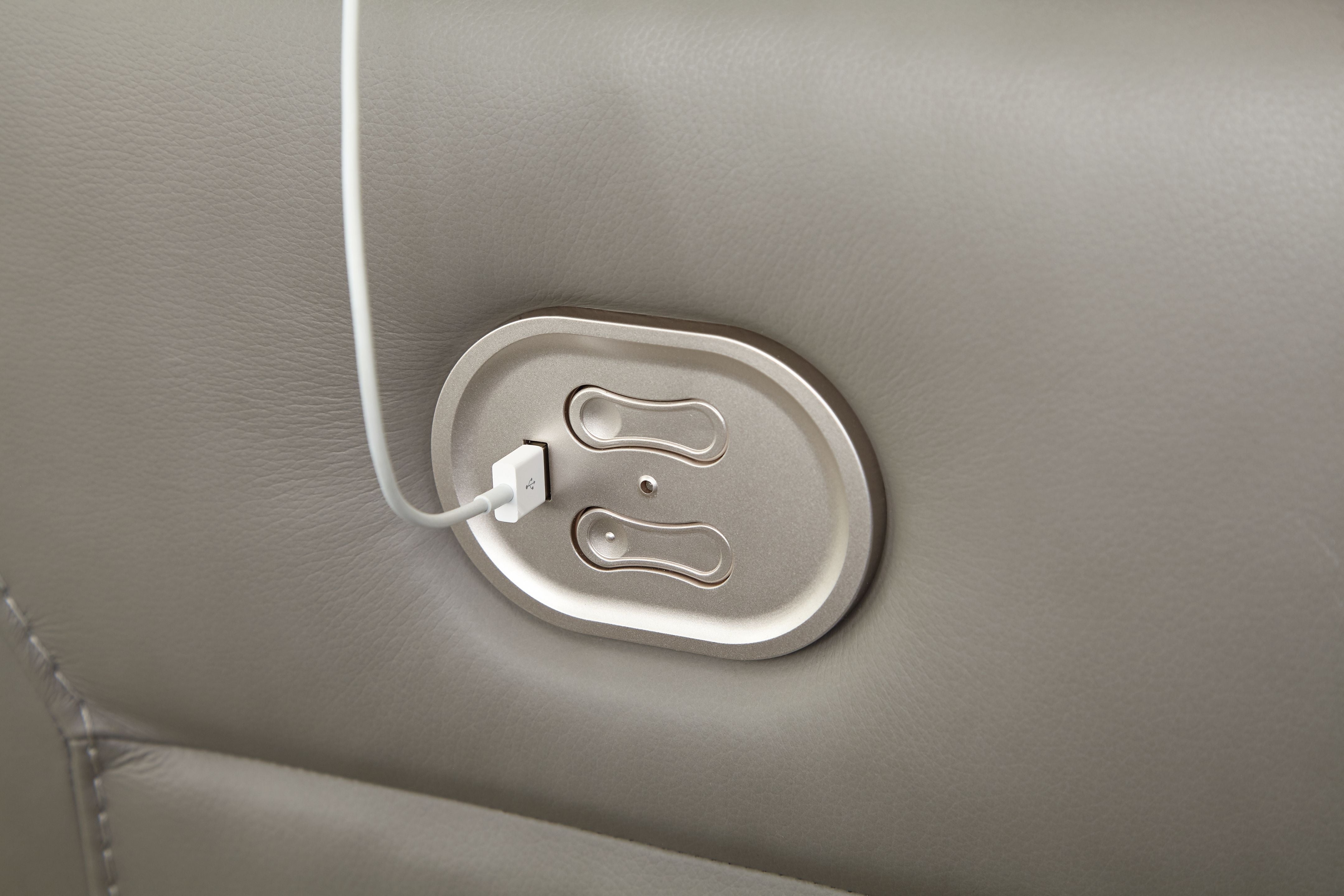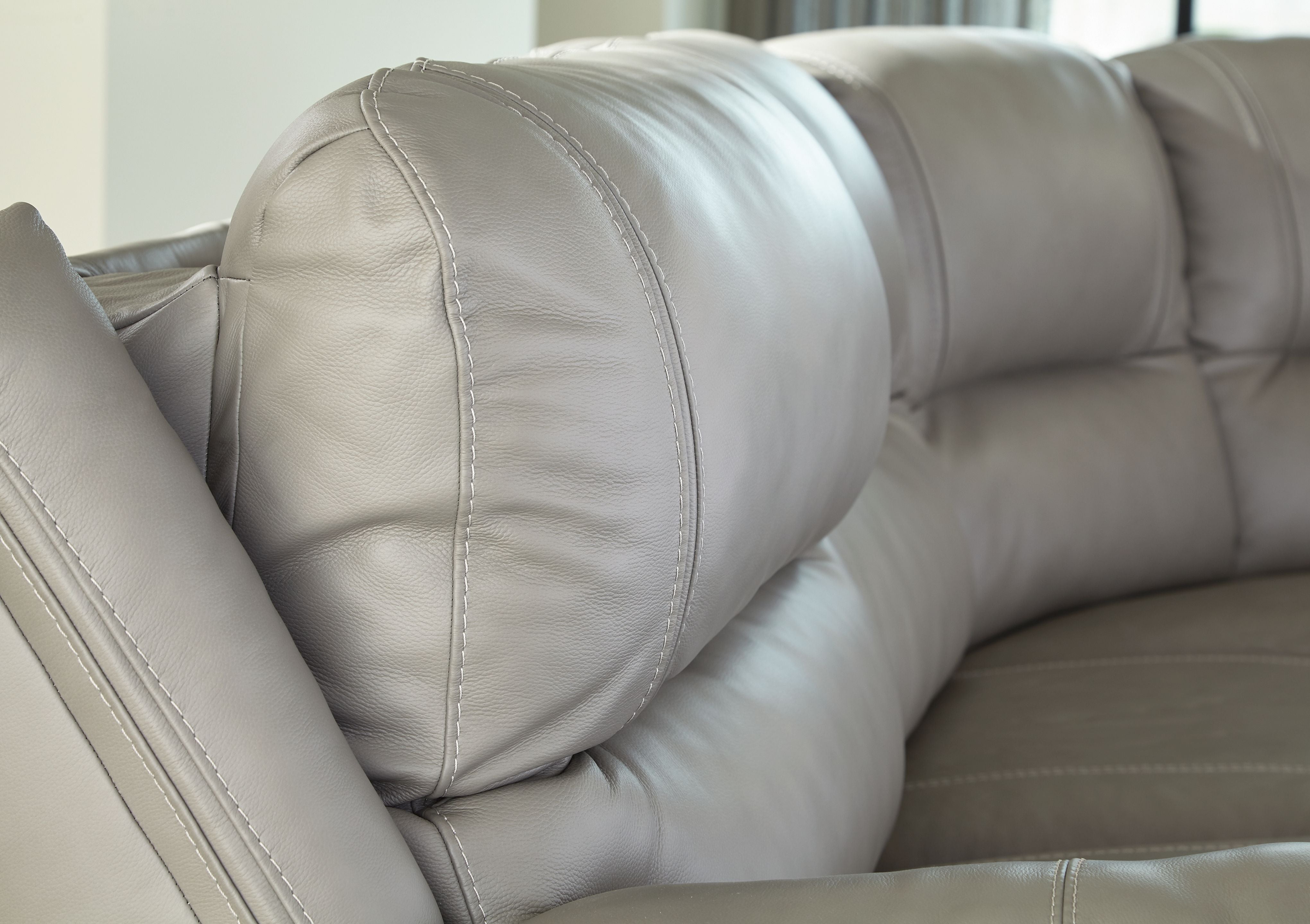 Load up on comfort in a cool, clean-lined and contemporary way with the Dunleith power reclining sectional in gray. Rest assured, you'll enjoy the feel of real leather everywhere your body touches (real leather interior seating/matching faux leather exterior). With a wonderfully soft hand, the heavyweight material is enriched with a pebble grain effect for authentic appeal and enhanced with jumbo stitching for dramatic contrast. It features a one-touch power control with adjustable positions and includes an Easy View™ adjustable headrest that allows a primo view of the TV even when you're reclined. Extended ottomans provide extra length for leg comfort. A zero-draw USB plug-in at your fingertips lets you charge up as you chill out.