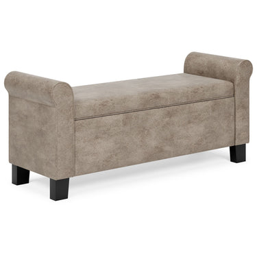 Sit and store in style. This storage bench is upholstered in a crisp light beige faux leather with roll arms for a touch of casual elegance. Its hinged seat lifts to reveal a fully lined interior storage compartment, perfect for storing extra linens or keeping clutter hidden. Solid wood legs in a black finish cleanly complete the look.
