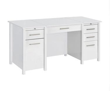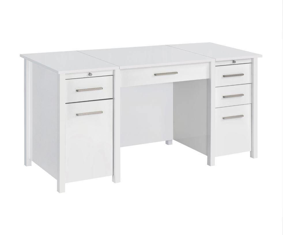 Create the perfect ergonomic home office setup with this contemporary lift top office desk. a smooth surface all around, this contemporary desk features clean lines and plenty of space for work or study. spacious drawers help organize office files and essentials, each one fastened with a sleek pull in a shiny brushed zinc finish. need extra writing space or a place to keep coffee nearby? this clever desk features two pull-out trays, one on each side. extra touches like smooth ball bearing glides and soft-close glides offer modern upgrades.