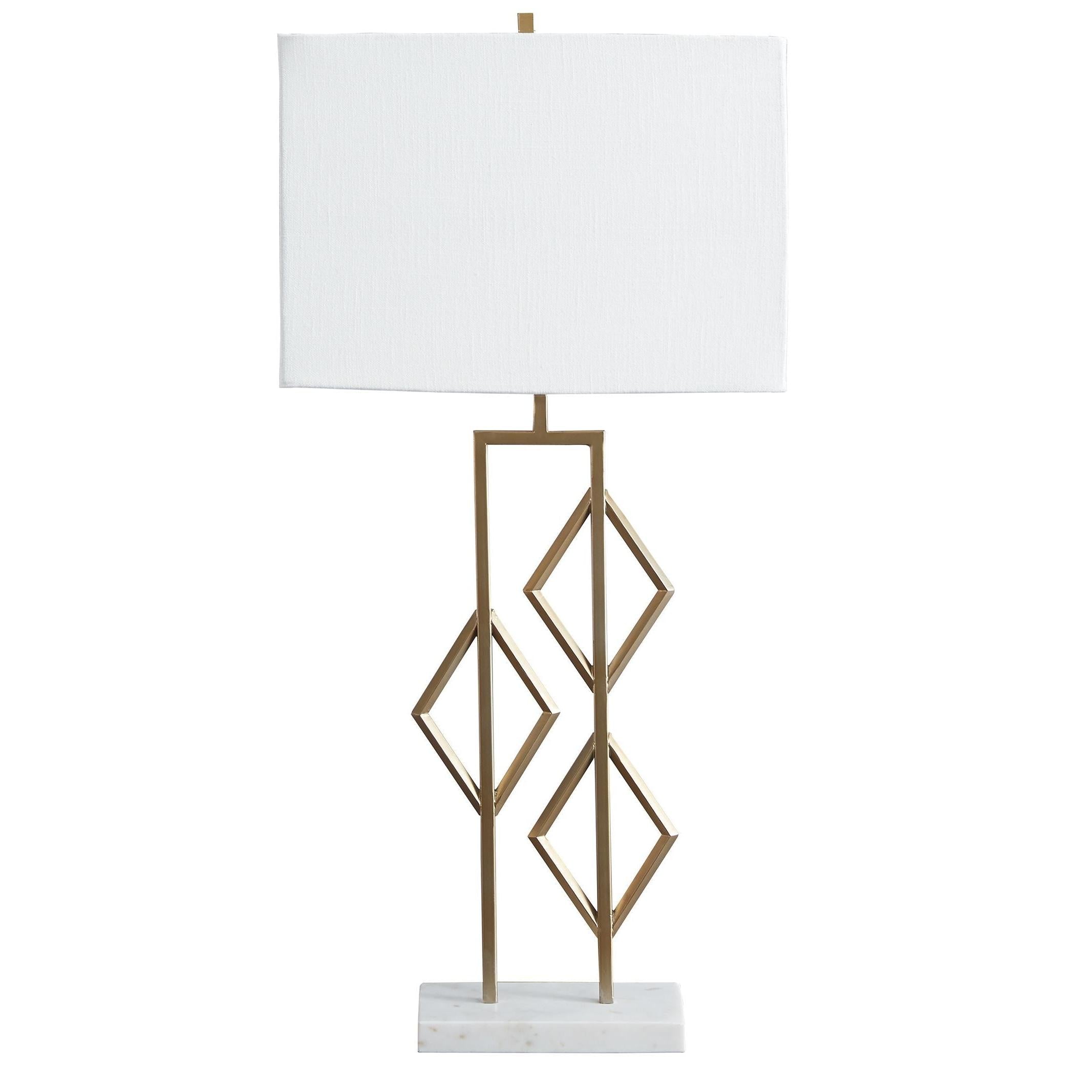 This ultra-modern metal table lamp is as much a striking sculpture as it is a source of lighting. Champagne-tone metal paired with white marble is gorgeous and glamorous. Rectangular hardback shade is a bold, brilliant choice.