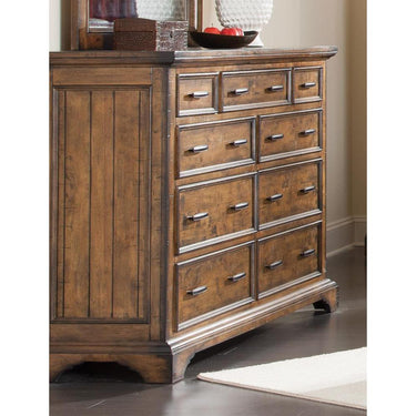The perfect marriage of classic colors and rustic charm, this nine-drawer dresser is stunning. featuring a vintage bourbon finish, the frame celebrates modern design with vertical rough sawn planks lining the sides. the slightly exposed wood grain offers depth to any space. store clothing and accessories in the drawers using the removable jewelry tray. traditional design elements, such as solid wood construction, create a sturdy and clean silhouette.
