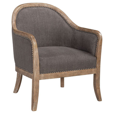 This modestly scaled accent chair is a chic design feat. Perfect for a corner spot or entryway, this curvaceous beauty sports a distressed finished frame and taupe-tone upholstery for an easy-on-the-eyes sensibility. Nailhead trim punctuating the front and back adds so much cool attitude.