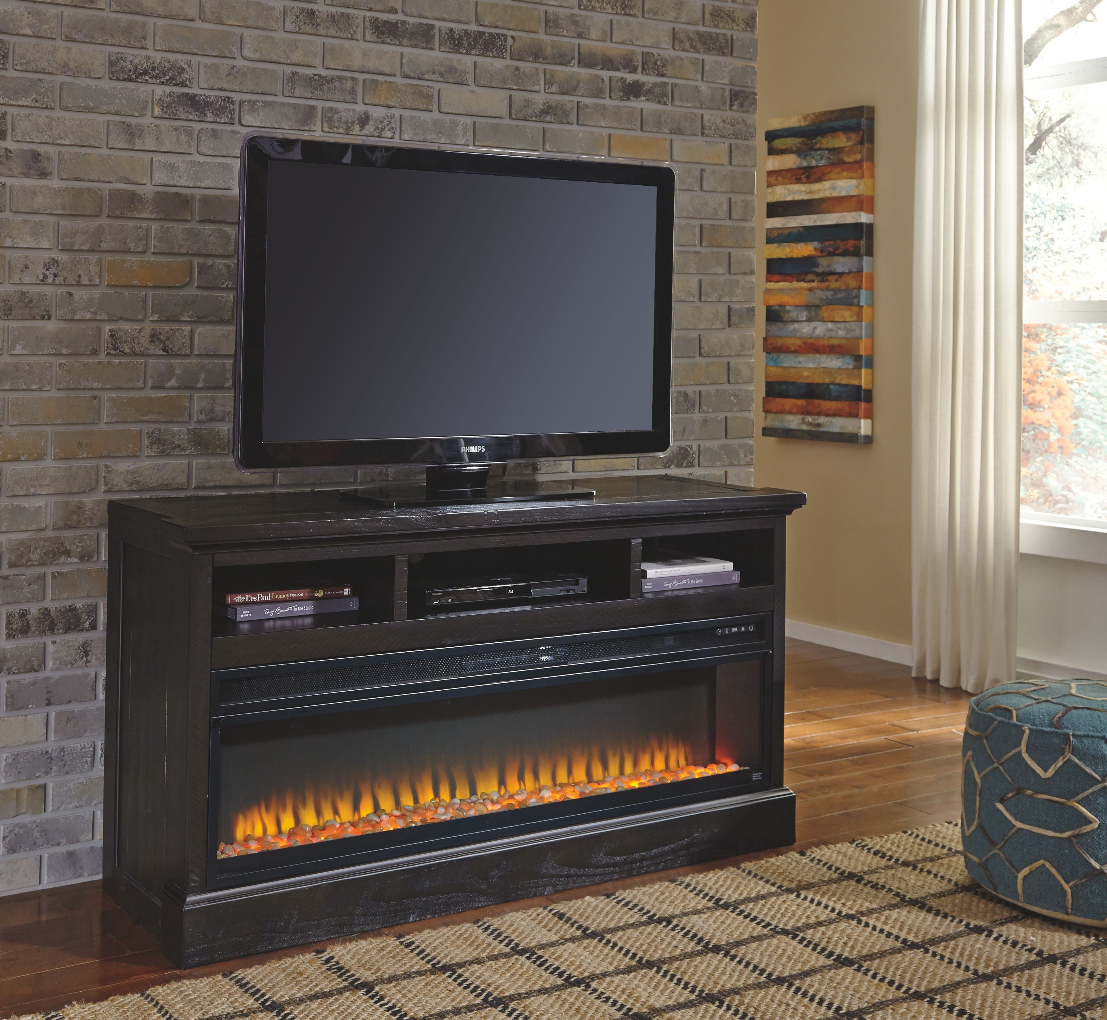 Add a touch of warmth and create beautiful ambiance for your TV viewing pleasure with this wide fireplace insert. Available as an addition on select TV stands and entertainment centers, this insert can easily replace a lower shelf in your entertainment center. With no hassle, maintenance or cleanup, delight in all the unique features of this fireplace via remote control. With the touch of a button, adjust the temperature, the color of the flame effect, or set the 12-hour timer for long-lasting enjoyment. Faux crystals enhance the flickering flame-or mix in stones for a natural touch (all included).