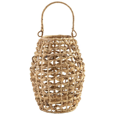 With its woven natural rattan and open-and-airy design, this lantern appeals to those turned on by a natural, bohemian sense of style. Holds one flameless pillar candle (not included).