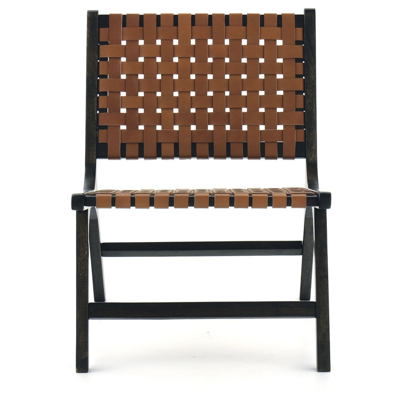 On-trend and exceedingly stylish, the Fayme mid-century modern lounge chair is sure to be hit with your contemporary home. Featuring a solid wood armless frame in dark brown finish with leather strip woven back and seat in camel-tone basket weave pattern.