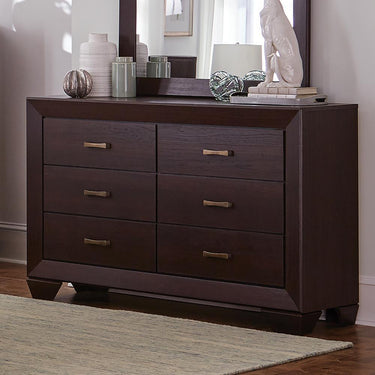 With a lovely, transitional style, this dresser infuses any bedroom with sensible sophistication. straight, squared-off lines create a strong silhouette. black, recessed grooves add eye-catching contrast to its rich, dark, cocoa finish. sleek, bar style drawer pulls add an appealing element of no-nonsense glamour. with six spacious drawers, this dresser keeps your space organized with ease.