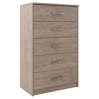 If you're a fan of clean, crisp and contemporary interiors, rest assured this chest suits you. The linear profile and flush-mount drawers are enhanced with a warm gray vintage finish with subtle pearl effect over replicated cherry grain. Large satin nickel-tone pulls are an artful touch. Hard to believe such a high-style aesthetic can be so attractively priced.