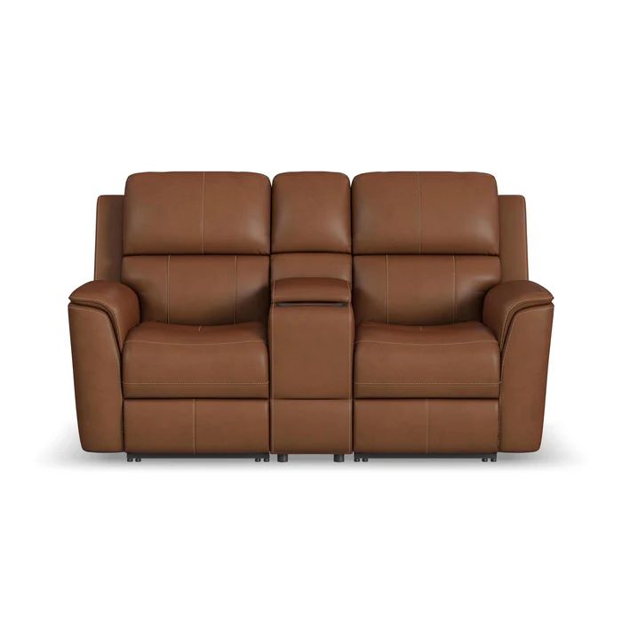 Treat yourself to a comfortable yet refined sitting experience with the Henry leather power reclining loveseat with console and power headrests and lumbar. This generously scaled frame is upholstered in a caramel brown leather, and features contoured seats and padded arms with a unique sculptural shape and welt trim. The center console contains a storage compartment, wireless charging tray and pop-out dual cupholders. Power recline, headrest and lumbar control on both sides allows for customized comfort, and included USB ports provide convenient device charging. The Zero Gravity recline technology gives the feeling of weightlessness while Flexsteel's patented Blue Steel Spring provides lasting seat support.