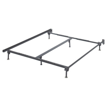 This sturdy metal bed frame supports queen/king/California king mattresses and box springs. Bolts connect the frame to most queen/king/California king headboards.