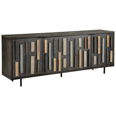 Elevate your contemporary home to a haven with an undeniably artistic attitude. This accent cabinet has a forward-thinking flair, featuring a modern mosaic created by strips of wood in varying hues against a dark brown and metallic gray finish. Fashionable and functional, the detailed doors open to reveal two shelves to suit all your storage needs.