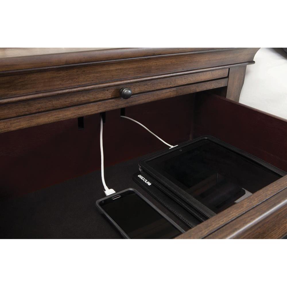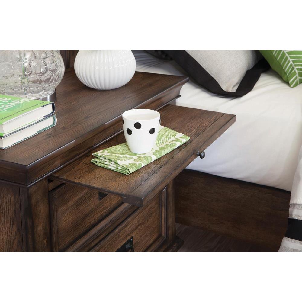 Radiate subtle rustic charm throughout a classic motif with this modern two-drawer nightstand. with features like a pull-out service tray and cord access for charging electronics, this nightstand is full of contemporary updates. the warmly hued drawer fronts feature a burnished oak finish and operate with self-closing glides. sleek and elongated, the dark hardware helps to streamline the timeless silhouette. intricate carvings on the tapered legs create a beautiful visual.