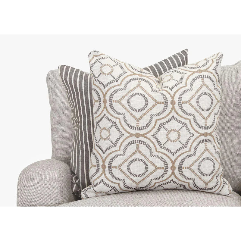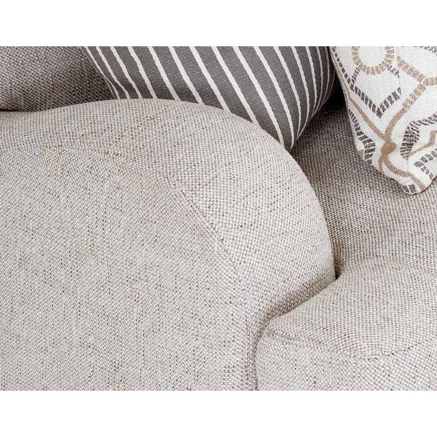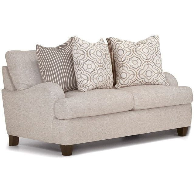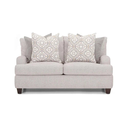 The Cambria Loveseat features a modern farmhouse aesthetic, upholstered in Torelli Moss, a medium beige polyester blend fabric. This loveseat features reversible seat and back cushions for increased durability.