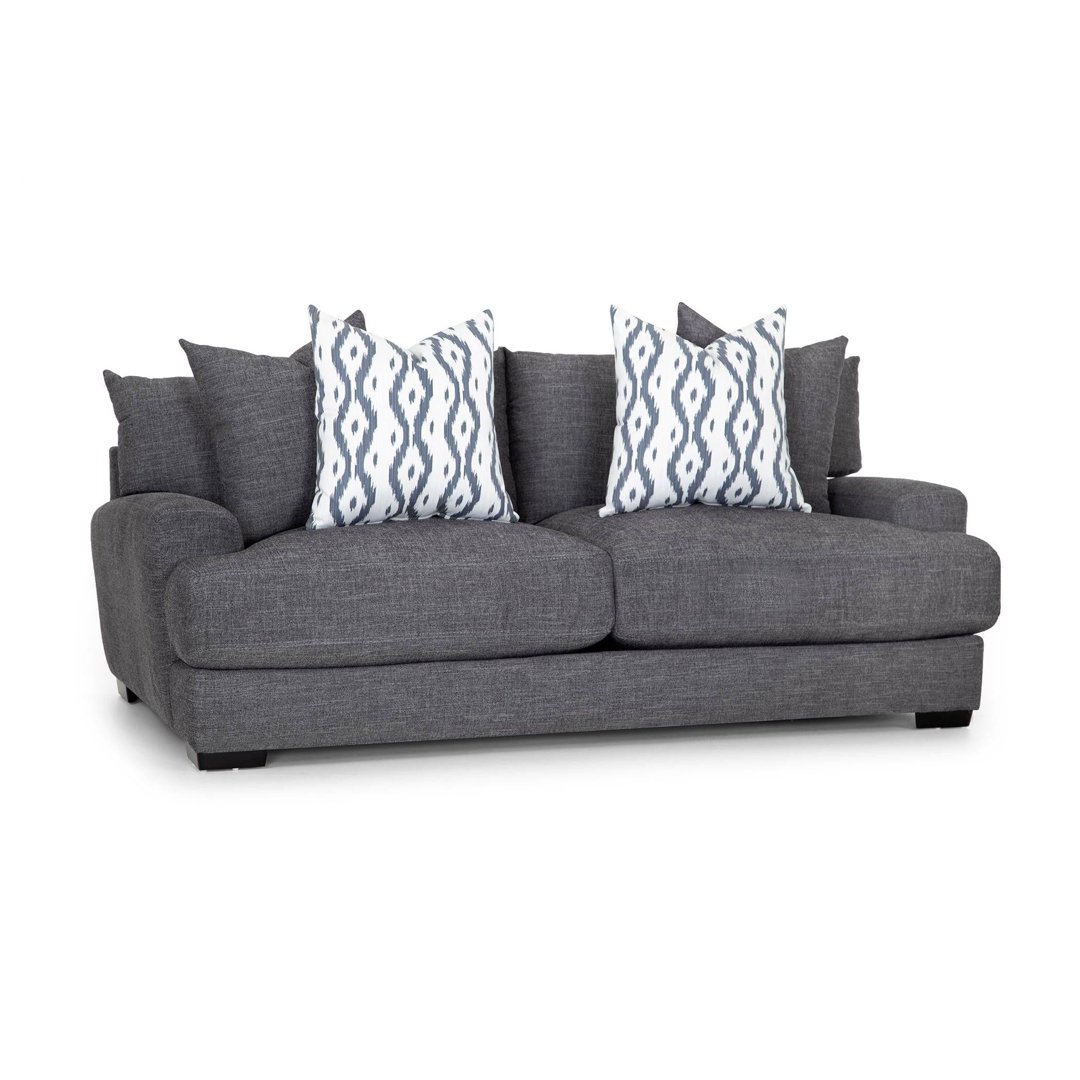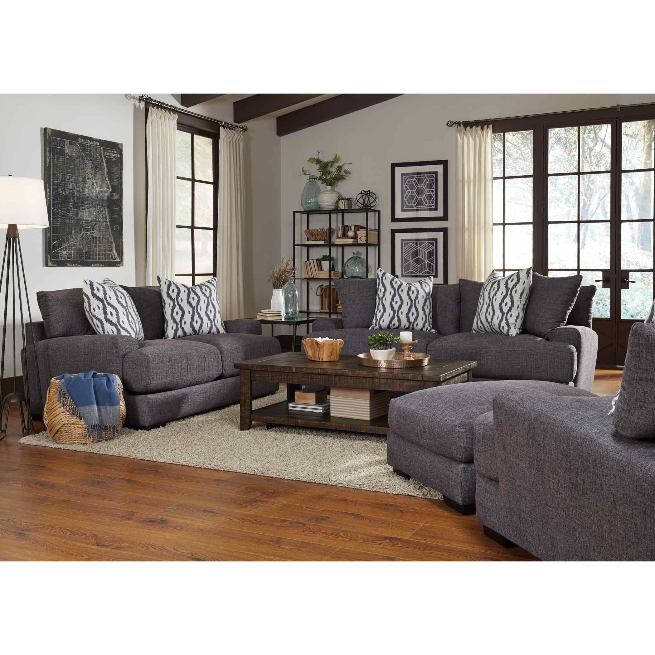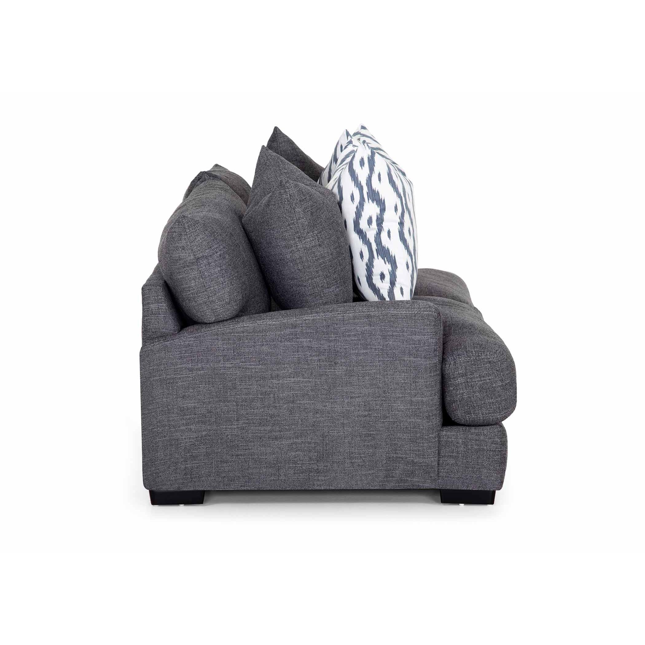 With its large-scale frame and deep seating, this group is ideal for those who love to lounge and unwind. The collection includes sofa, loveseat, matching chair and a half and ottoman. All pieces are upholstered in a soft, durable dark gray fabric, with coordinating throw pillows that add a visual contrast to complete the overall look.