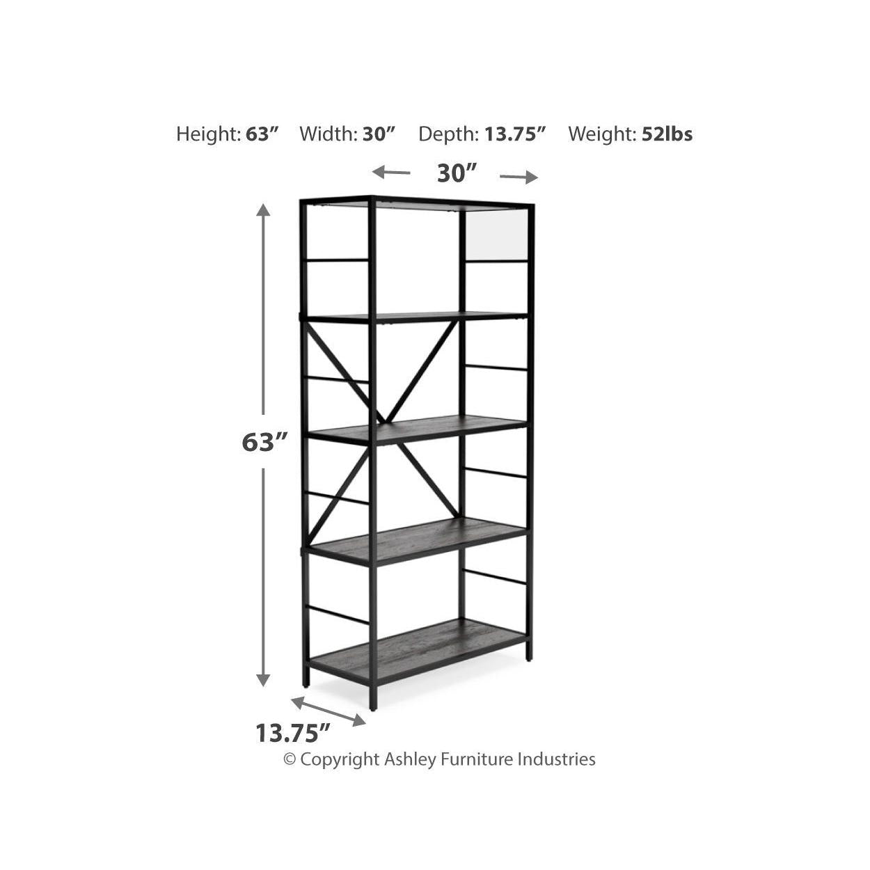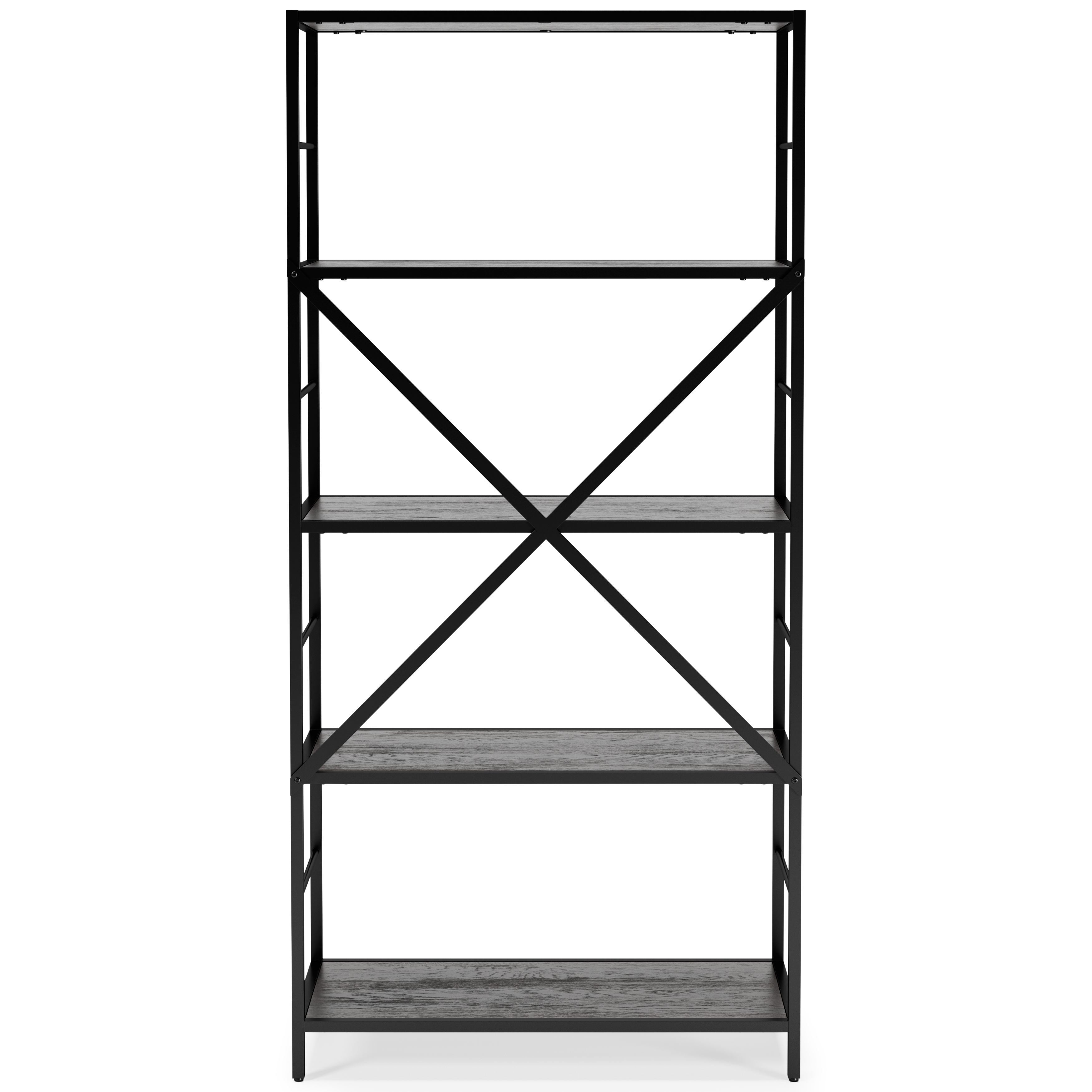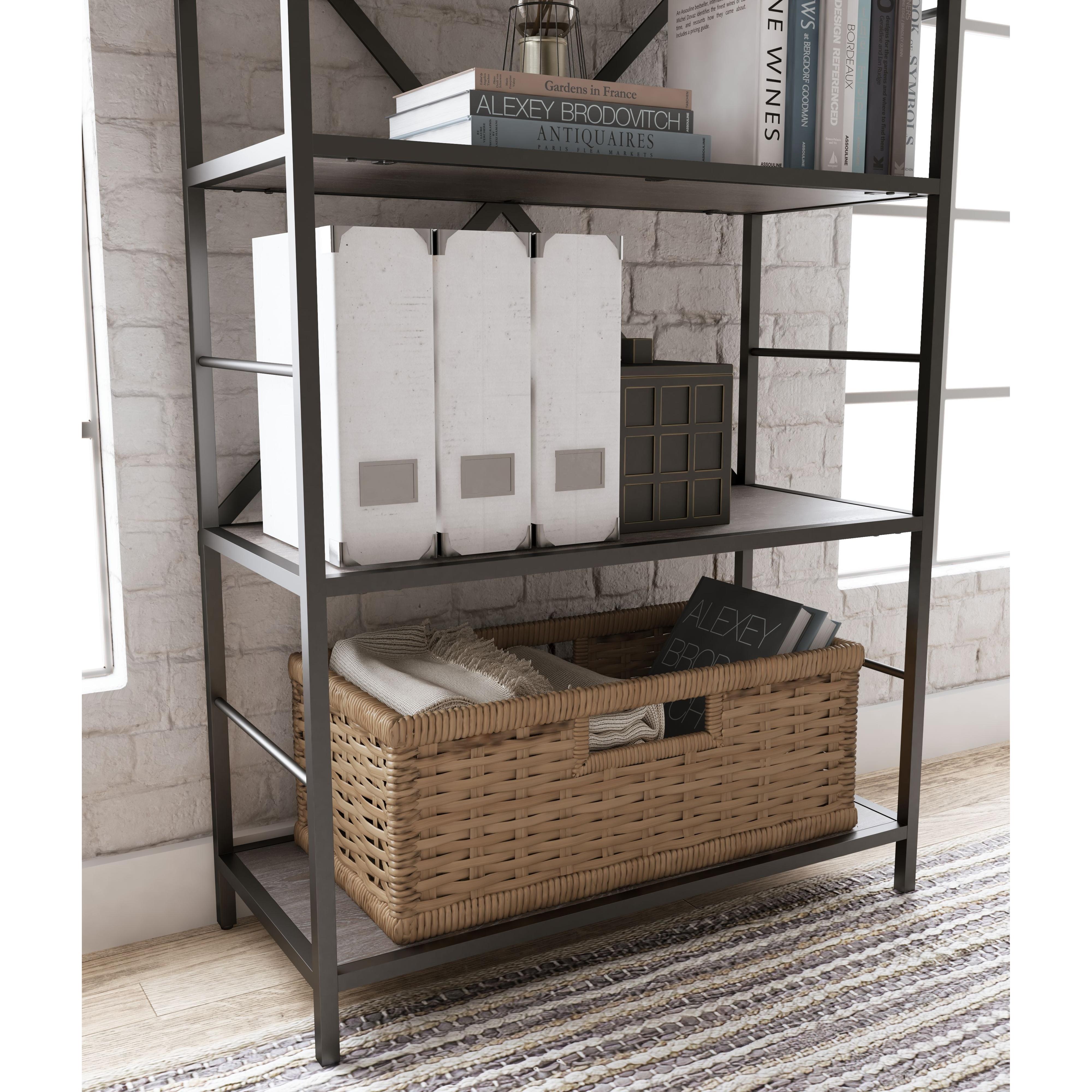 Love an urban farmhouse aesthetic? Make it work to your advantage with this beautifully styled bookcase. Distinctive elements include a gray decorative wood grain laminate contrasted with black iron-tone metal. Cross-buck rails give it that unmistakable modern farmhouse feel. Load it up with books, decorative storage baskets or home accents. However you use it, you'll love its open-concept design and right-on-trend look and feel.