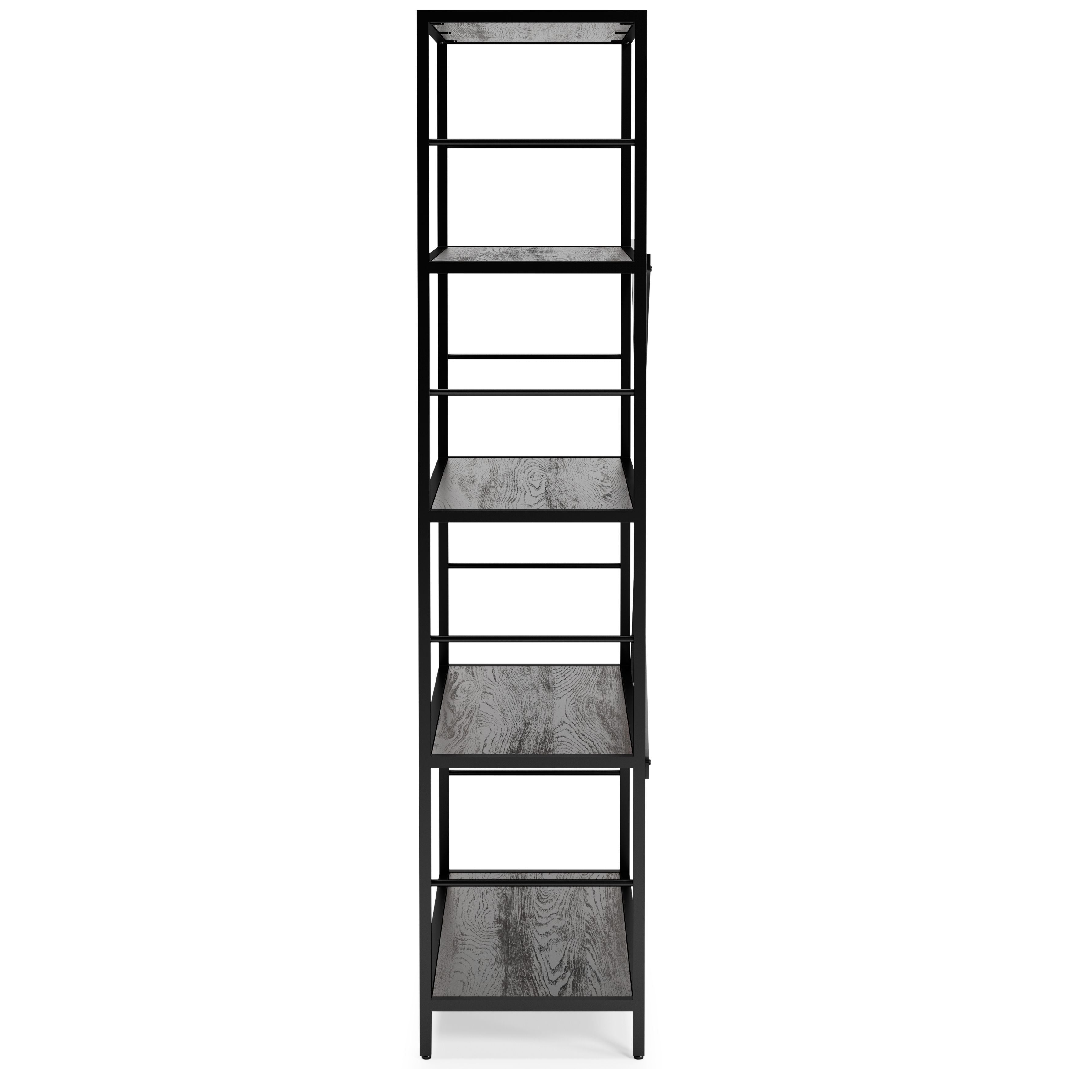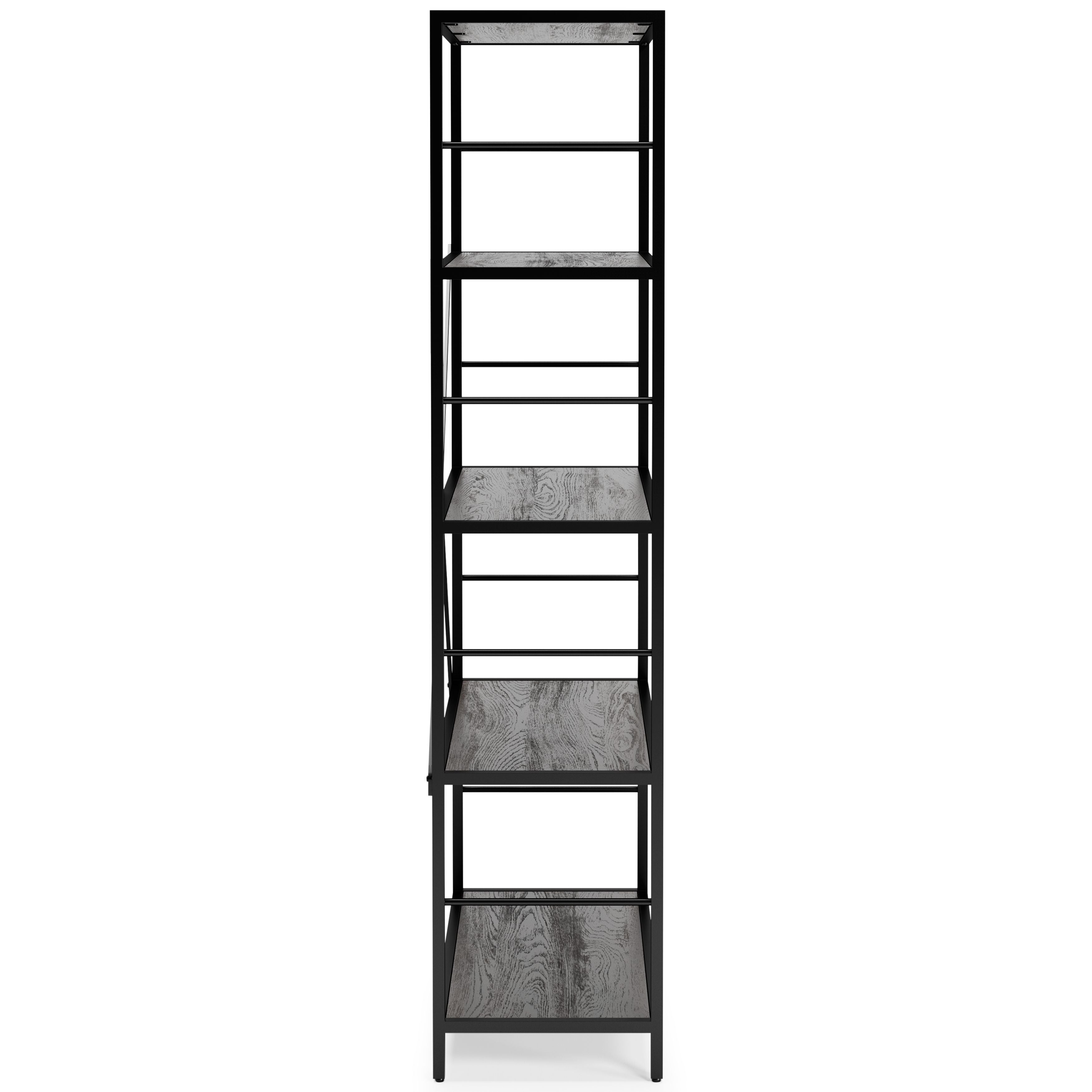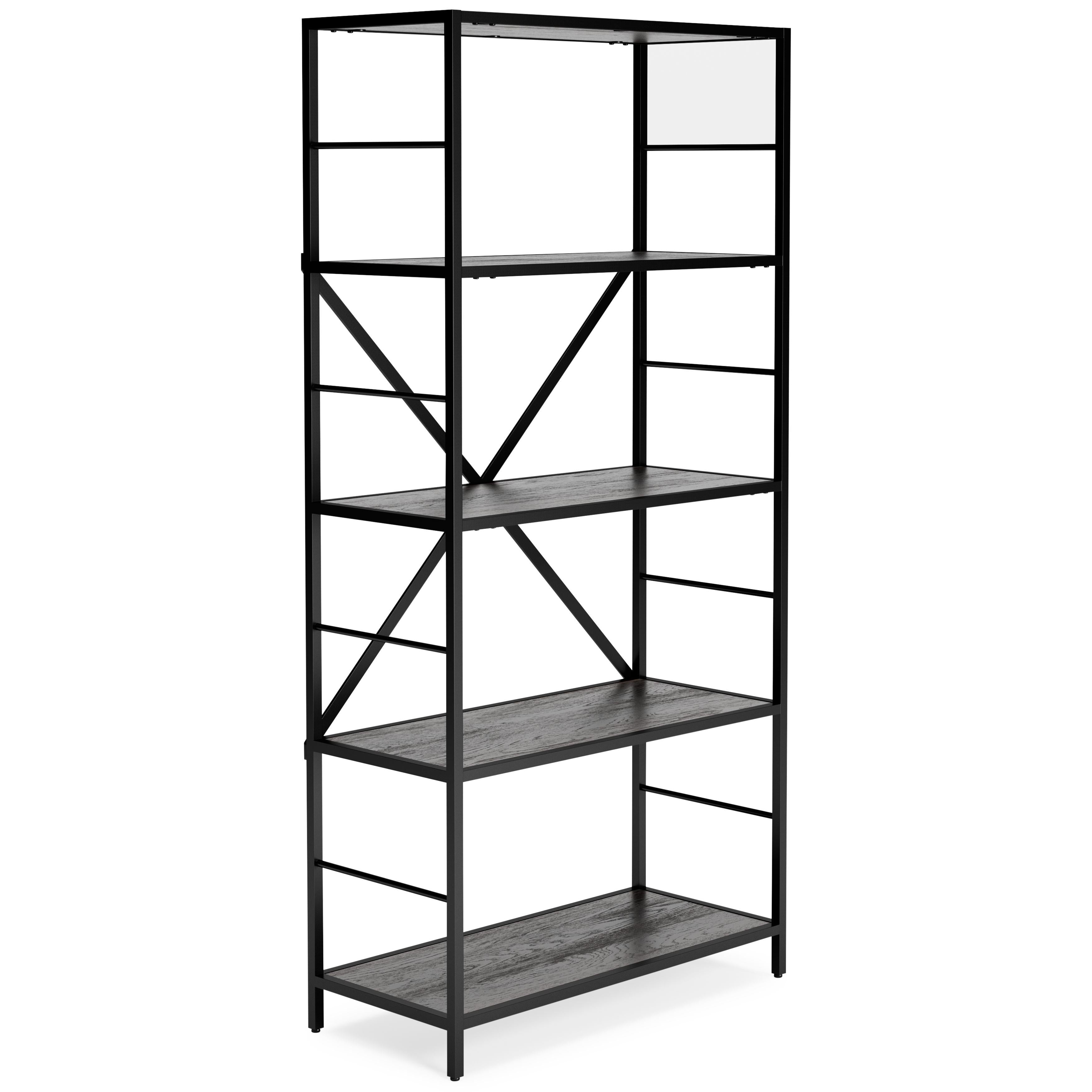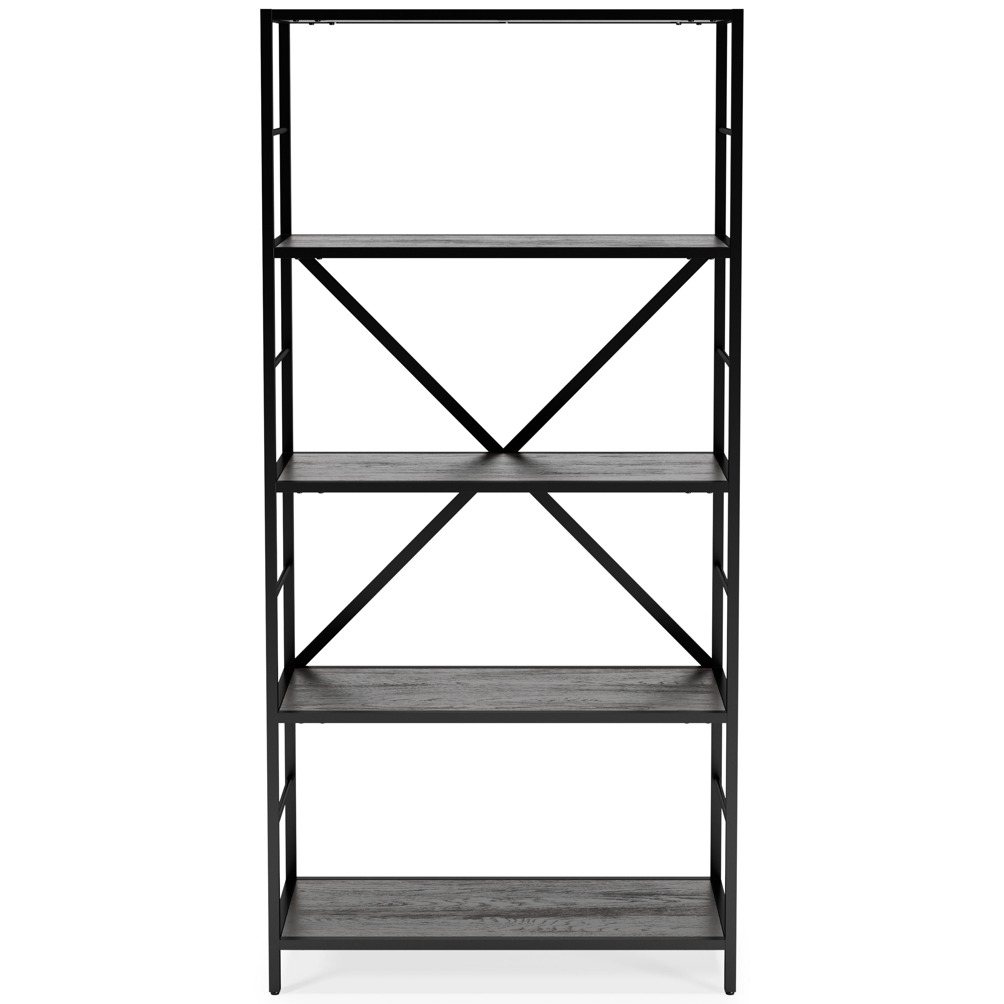 Love an urban farmhouse aesthetic? Make it work to your advantage with this beautifully styled bookcase. Distinctive elements include a gray decorative wood grain laminate contrasted with black iron-tone metal. Cross-buck rails give it that unmistakable modern farmhouse feel. Load it up with books, decorative storage baskets or home accents. However you use it, you'll love its open-concept design and right-on-trend look and feel.