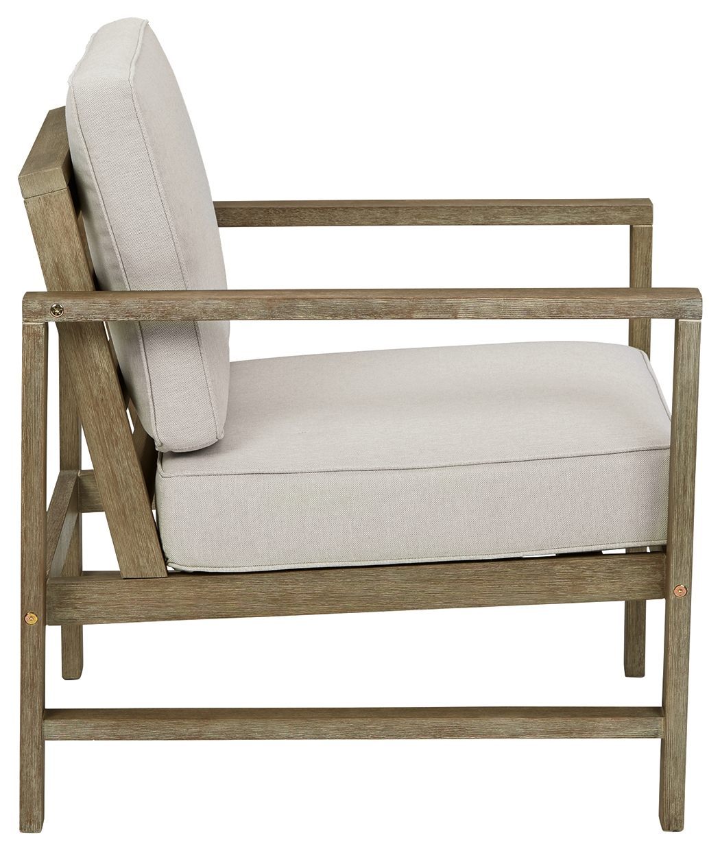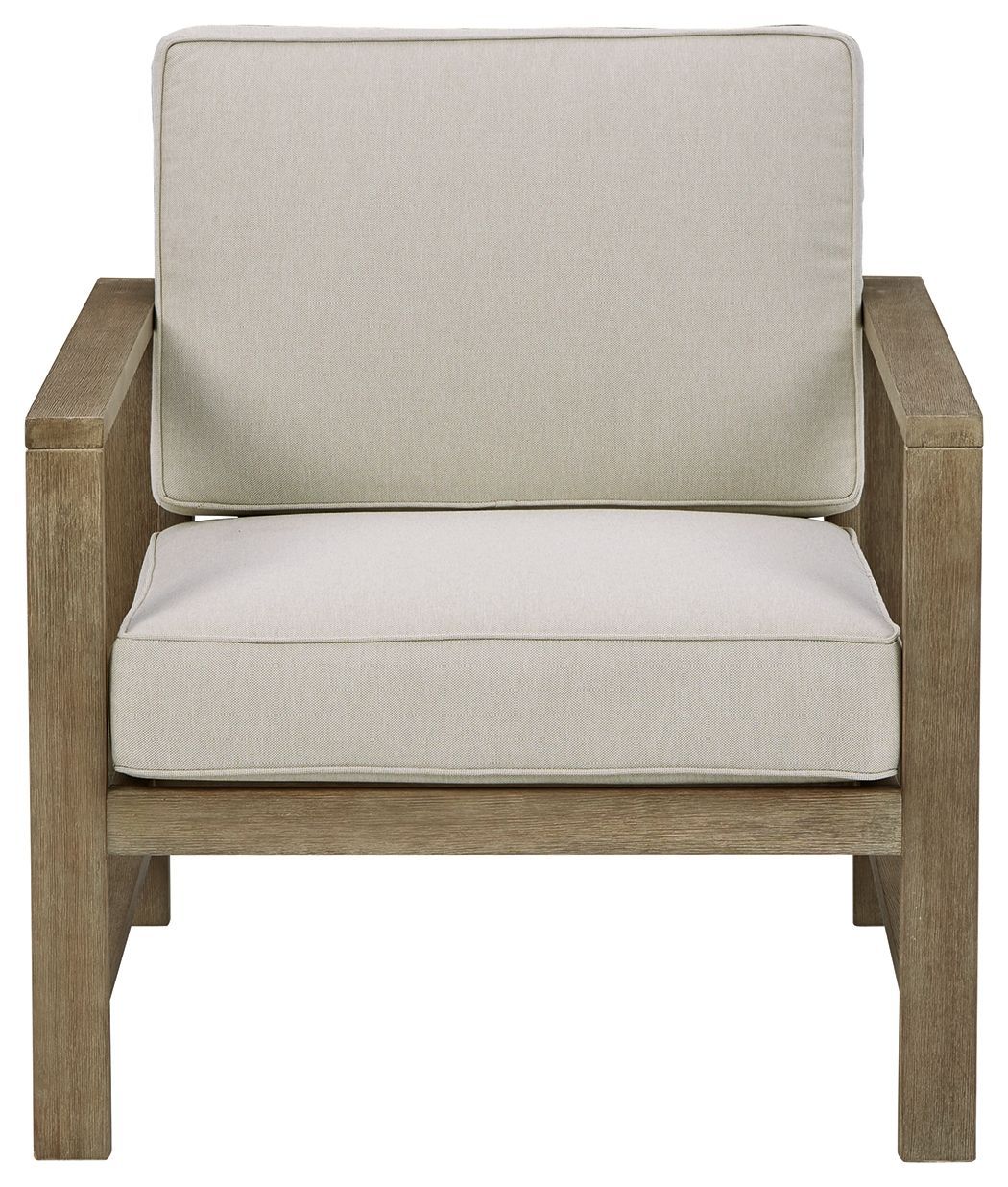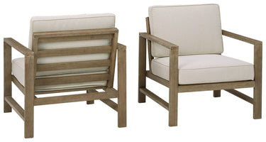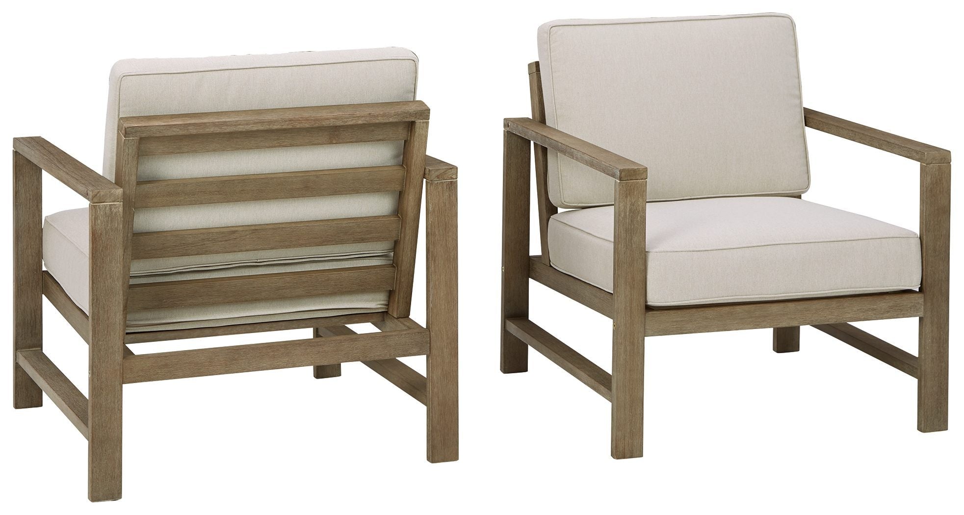 With its sleek lines, gorgeous driftwood tone and cushioned comfort, this 2-piece outdoor lounge chair set can make your outdoor space feel more like an upscale resort. Made for looks and longevity, this high-quality ensemble is built from eucalyptus wood treated to a deluxe embossed finish to brave the elements. The thick, all-weather seat cushions and back pillows are wrapped in a delightfully neutral Nuvella� fabric that's a breeze to clean.