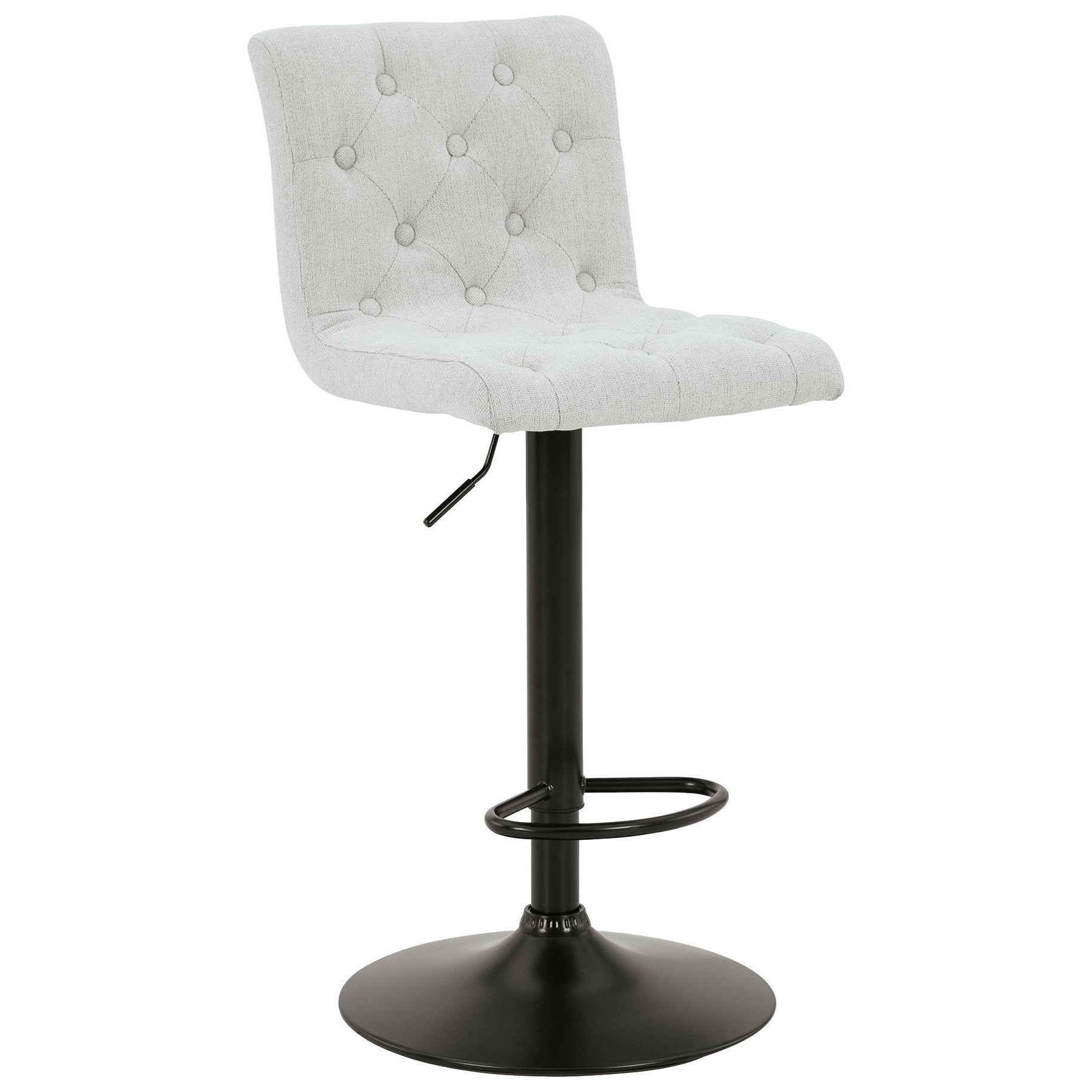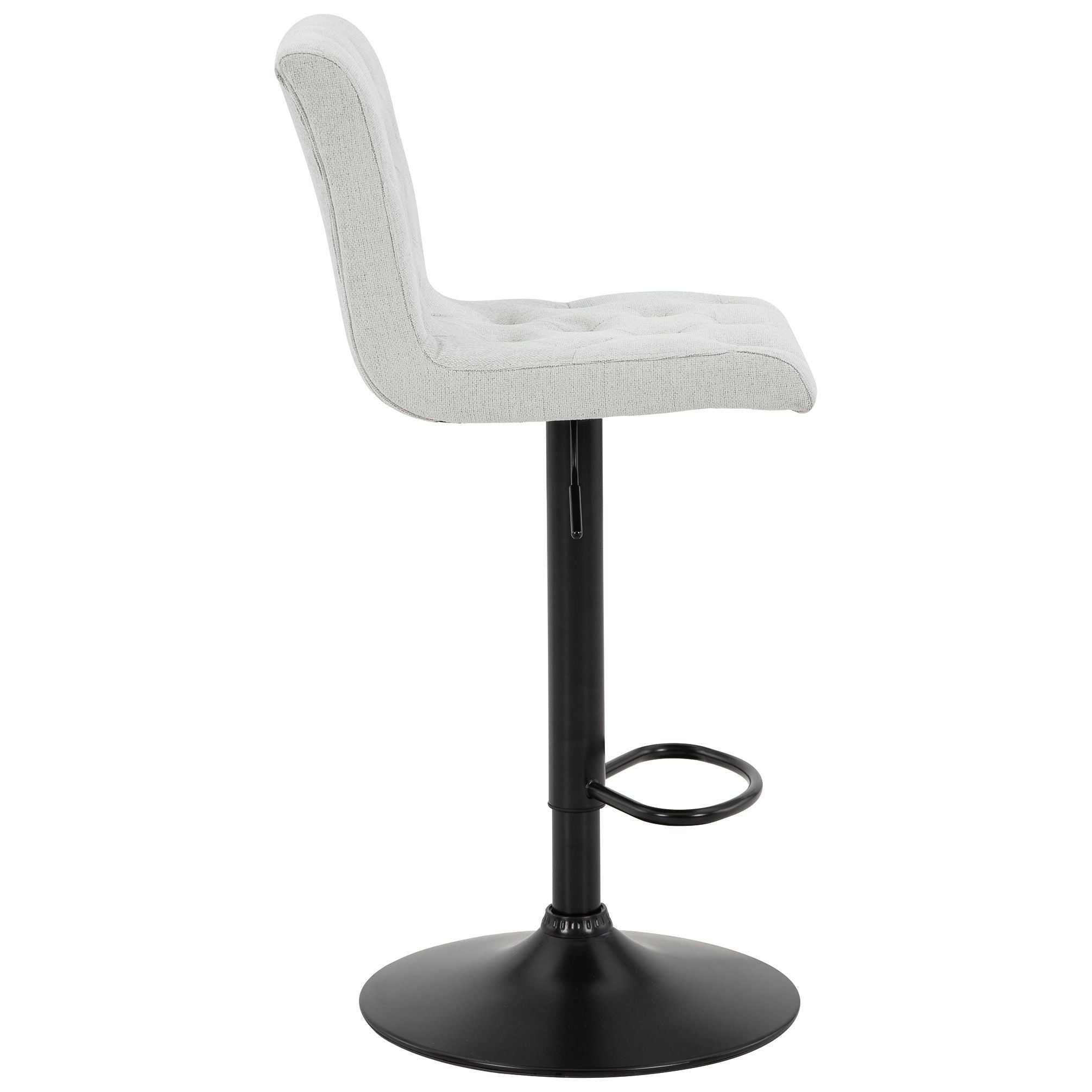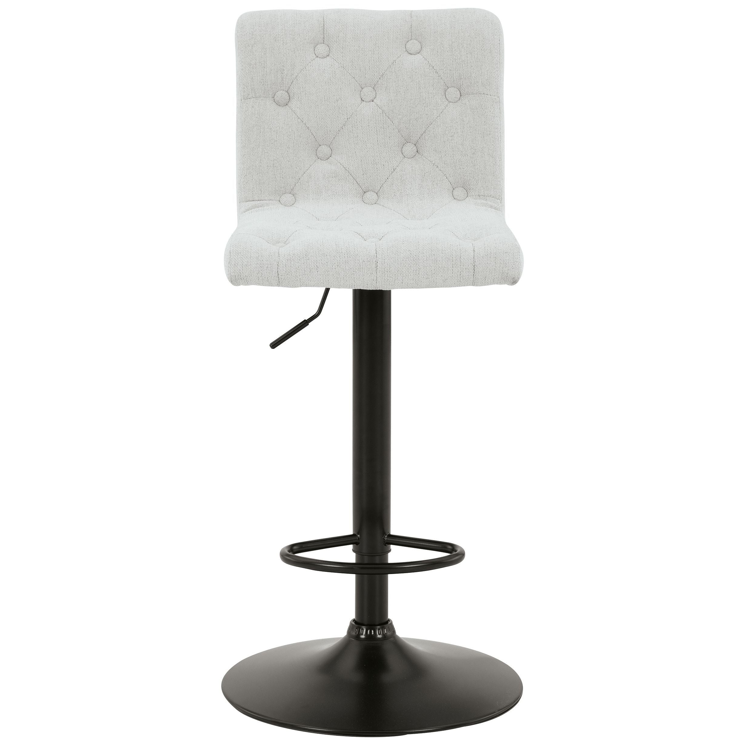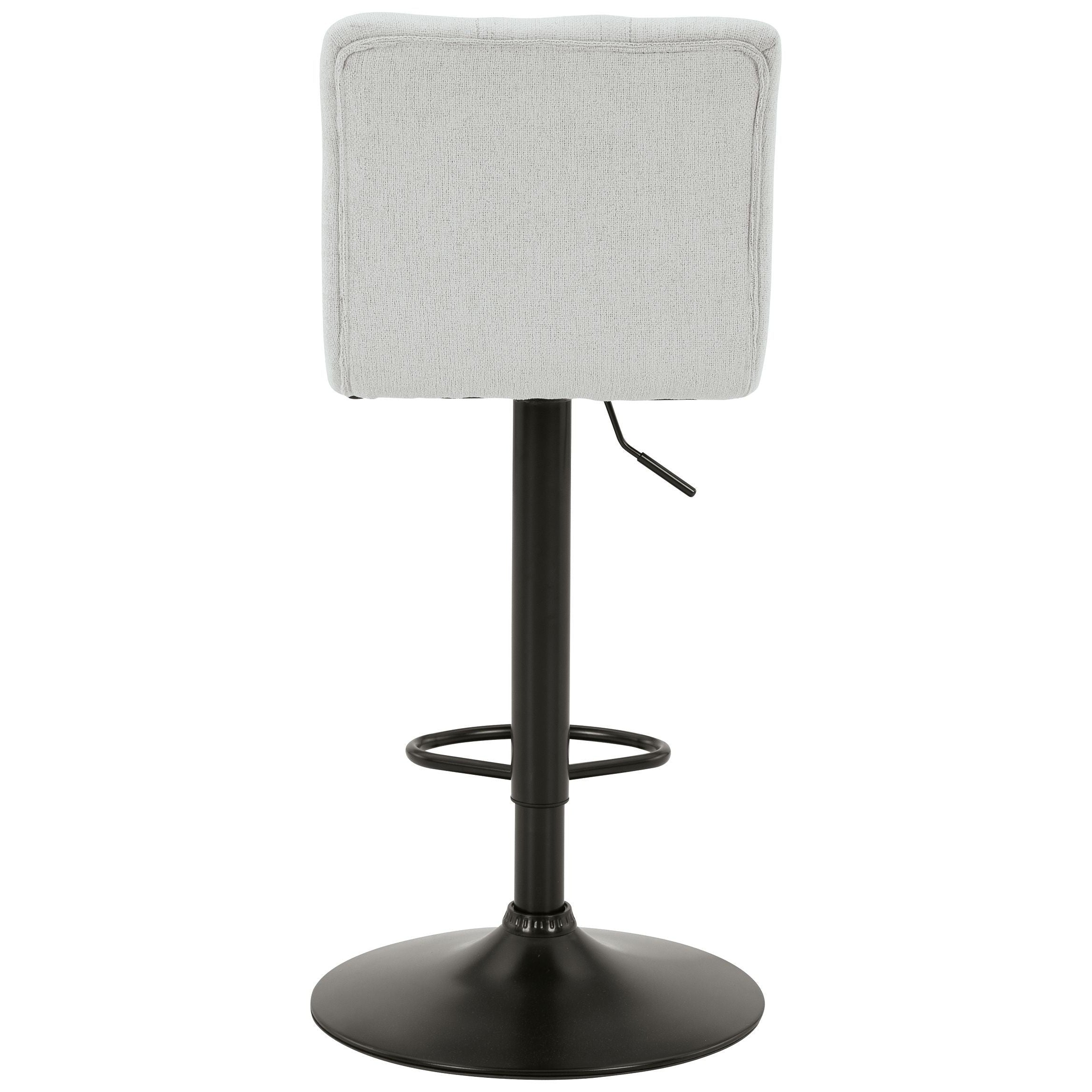 In search of a transitional design with desirable function? Look no further than this upholstered bar stool. Featuring tufted, light beige upholstery and a matte black base, it makes a simple-but-effective style statement. Full-circle swivel motion and an incorporated footrest make it easy to kick back and relax with guests. With an adjustable design that moves from counter to pub height with ease, this versatile stool is a must-have.