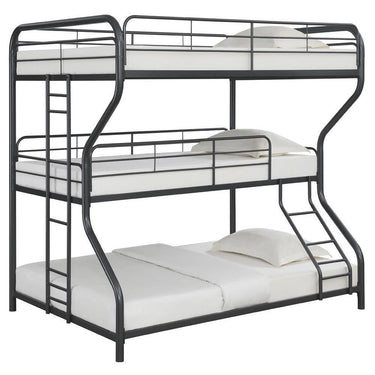Compact spaces and large families love this triple bunk bed. the modern design is enhanced with clean lines and durable heavy gauge steel construction. finished in a gunmetal, this stylish triple bunk bed brings function and aesthetics to a youth's bedroom. find two attached ladders available to access the middle and top bunks. with sturdy guardrails, you will feel peace of mind for the safety of your little ones.