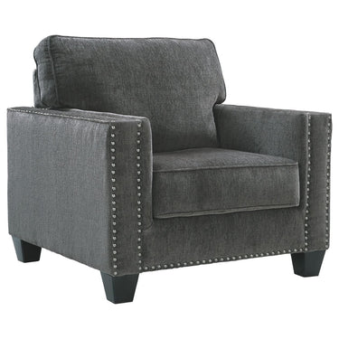 Time to go gray? Find your fill of comfort, style and sophistication in this chair. Its smoky gray upholstery is sumptuously soft to the touch and beautifully on trend. Ultra-clean lines punctuated with black nickel-tone nailhead trim give this gorgeous gray upholstered chair a cool, contemporary edge.